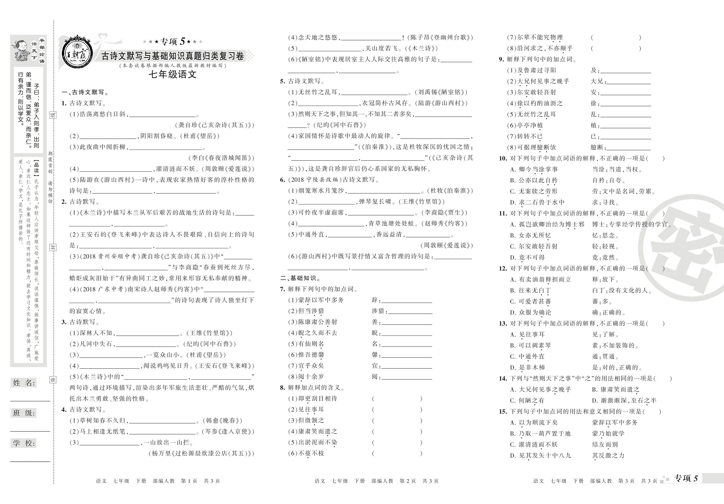 王朝霞期末专项卷——古诗文默写与基础知识、课内文言文阅读真题归类复习卷七年级下册语文(人教版)_R21080241427【0】