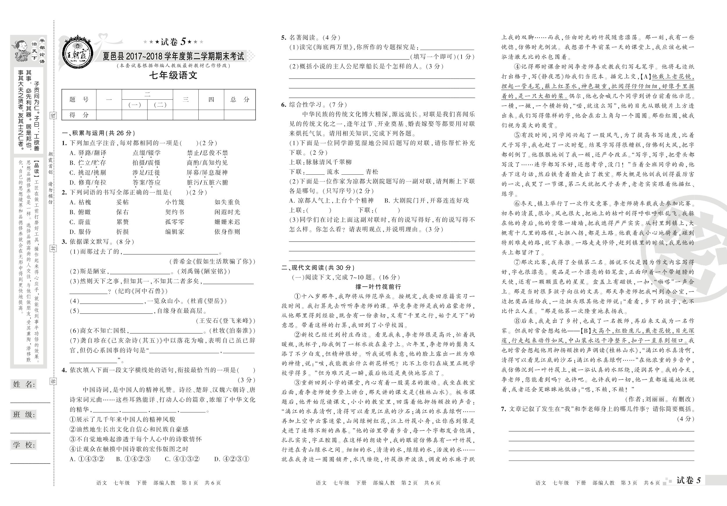 2017-2018学年第二学期商丘市夏邑县七年级语文试卷(人教版)【5】