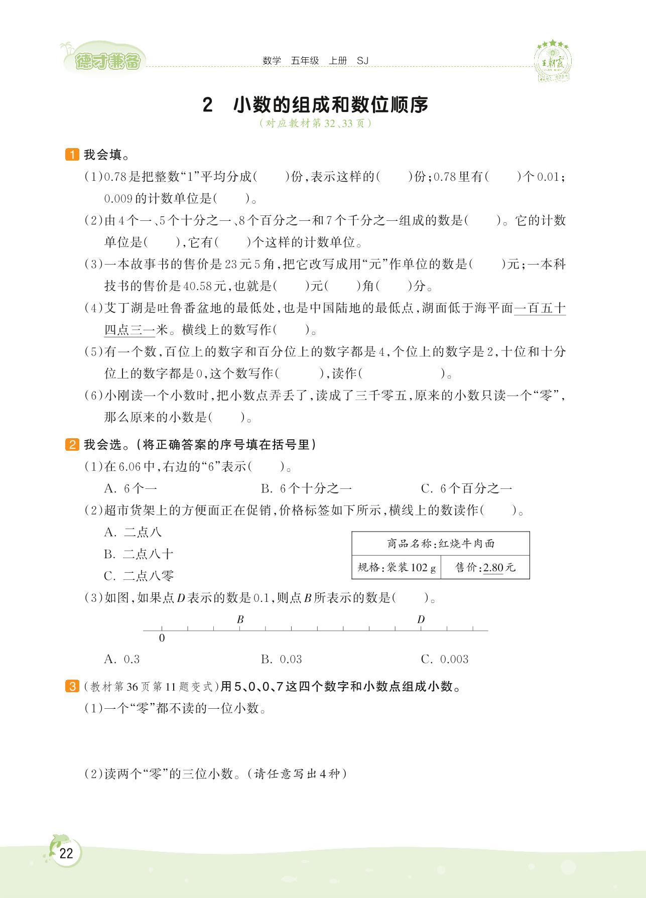 2022上册五年级数学苏教版 第三单元 小数的意义和性质——2 小数的组成和数位顺序