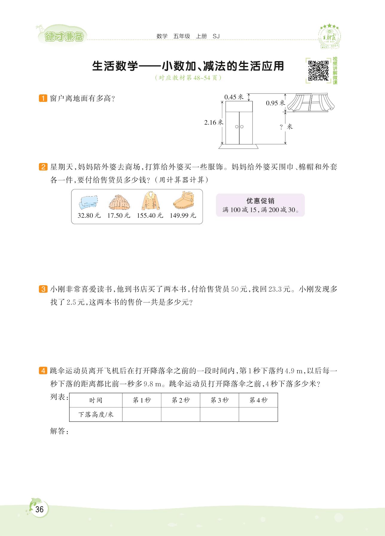 2022上册五年级数学苏教版 第四单元 小数加法和减法——生活数学 小数加、减法的生活应用