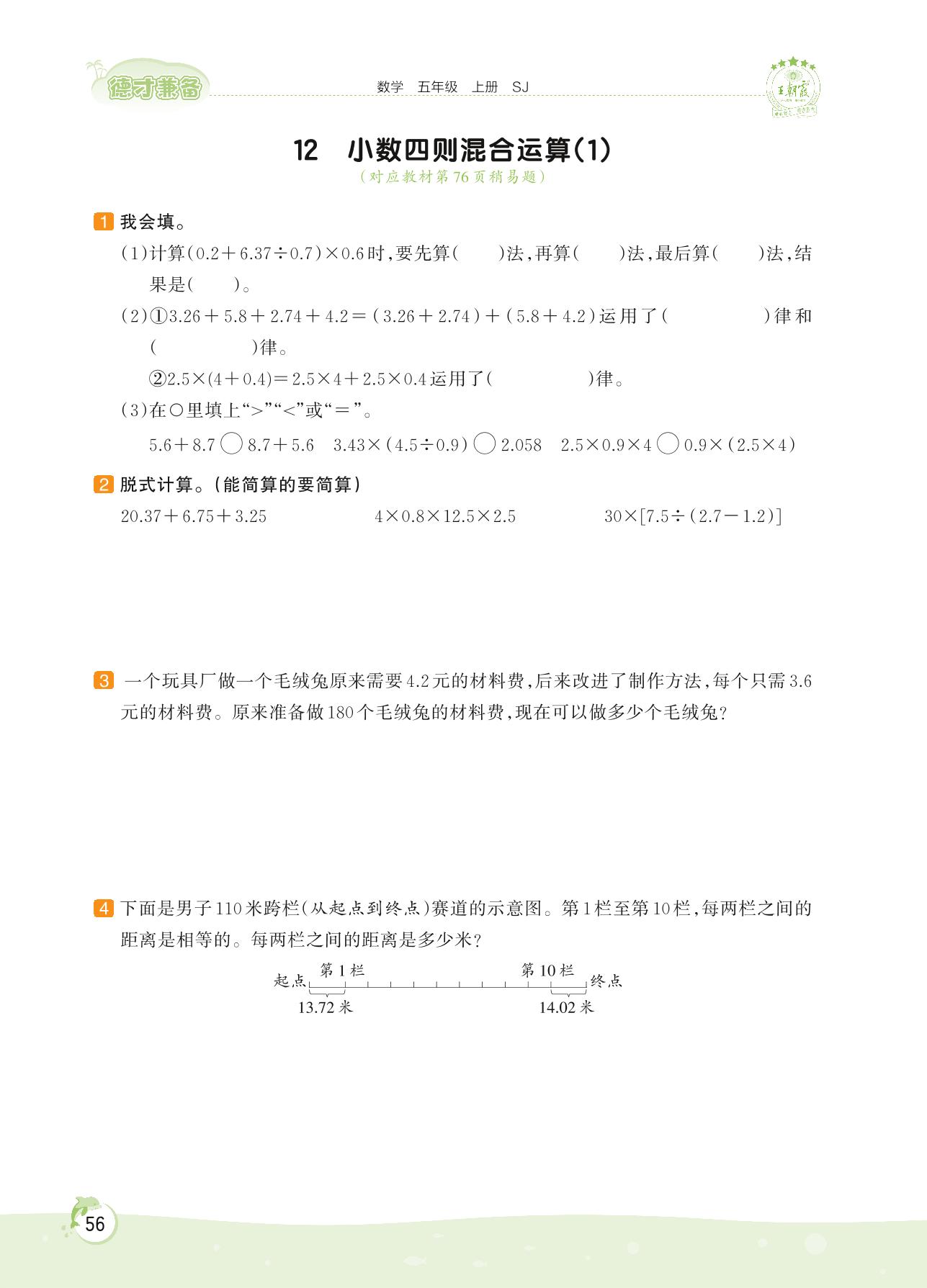 2022上册五年级数学苏教版 第五单元 小数乘法和除法——12 小数四则混合运算(1)