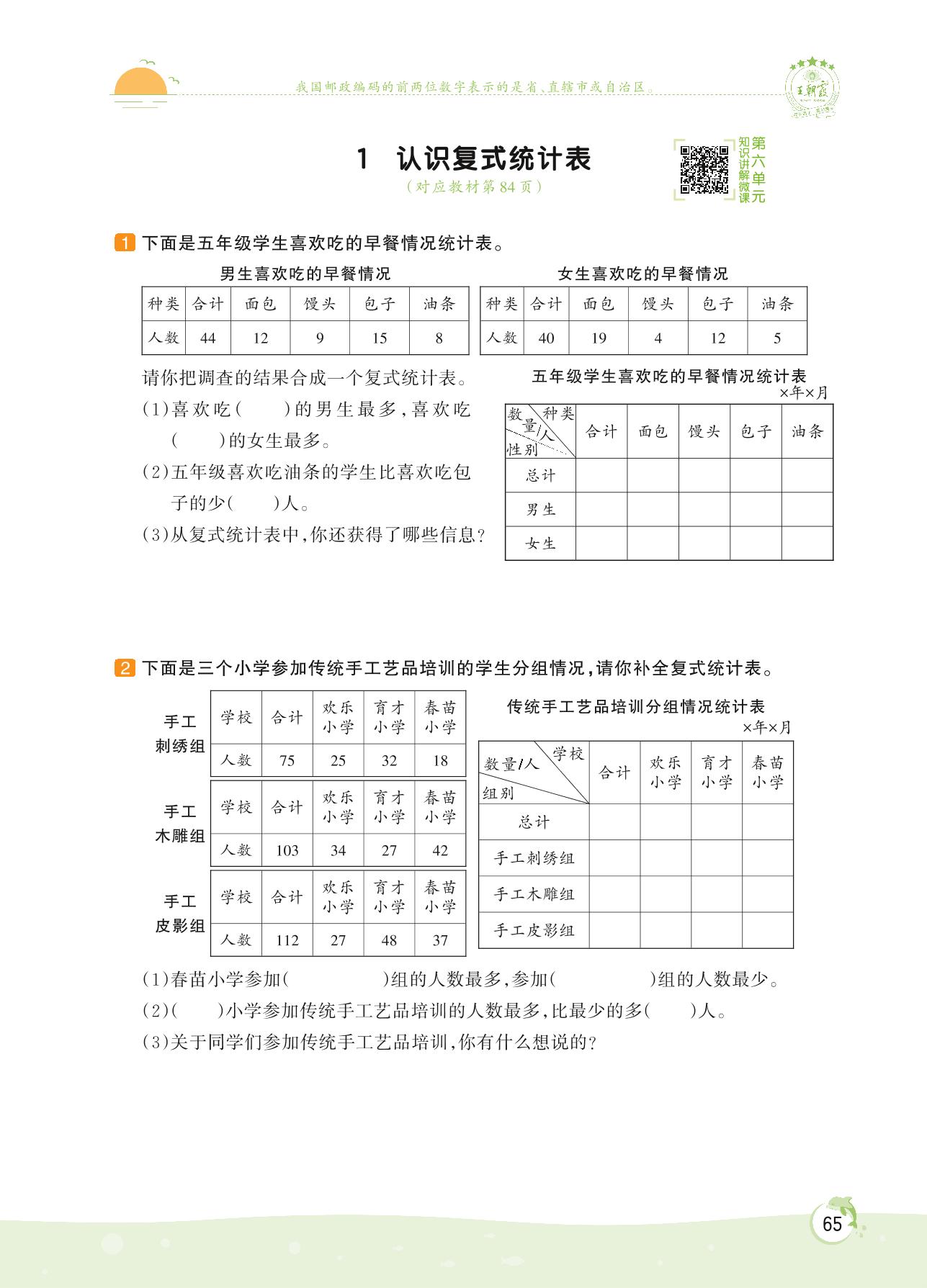 2022上册五年级数学苏教版 第六单元 统计表和条形统计图(二)——1 认识复式统计表