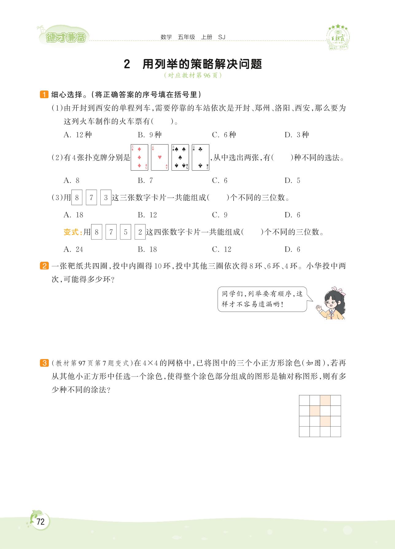 2022上册五年级数学苏教版 第七单元 解决问题的策略——2 用列举的策略解决问题