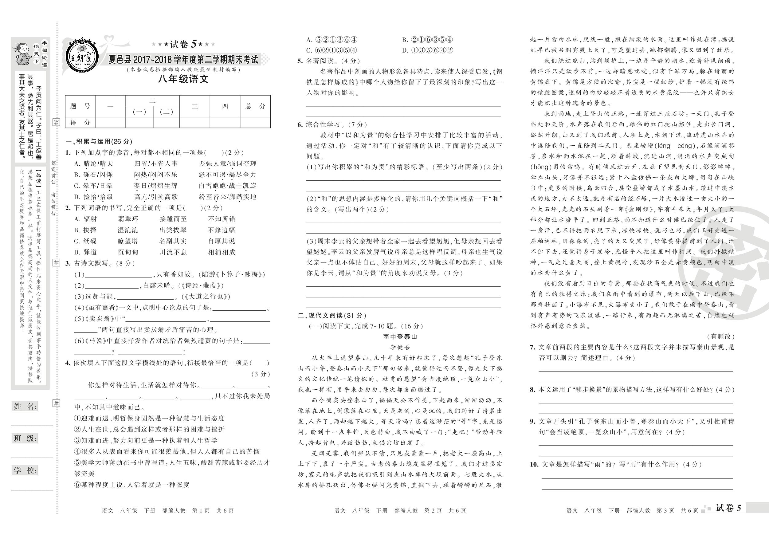 2017-2018学年第二学期商丘市夏邑县八年级语文试卷(人教版)【5】