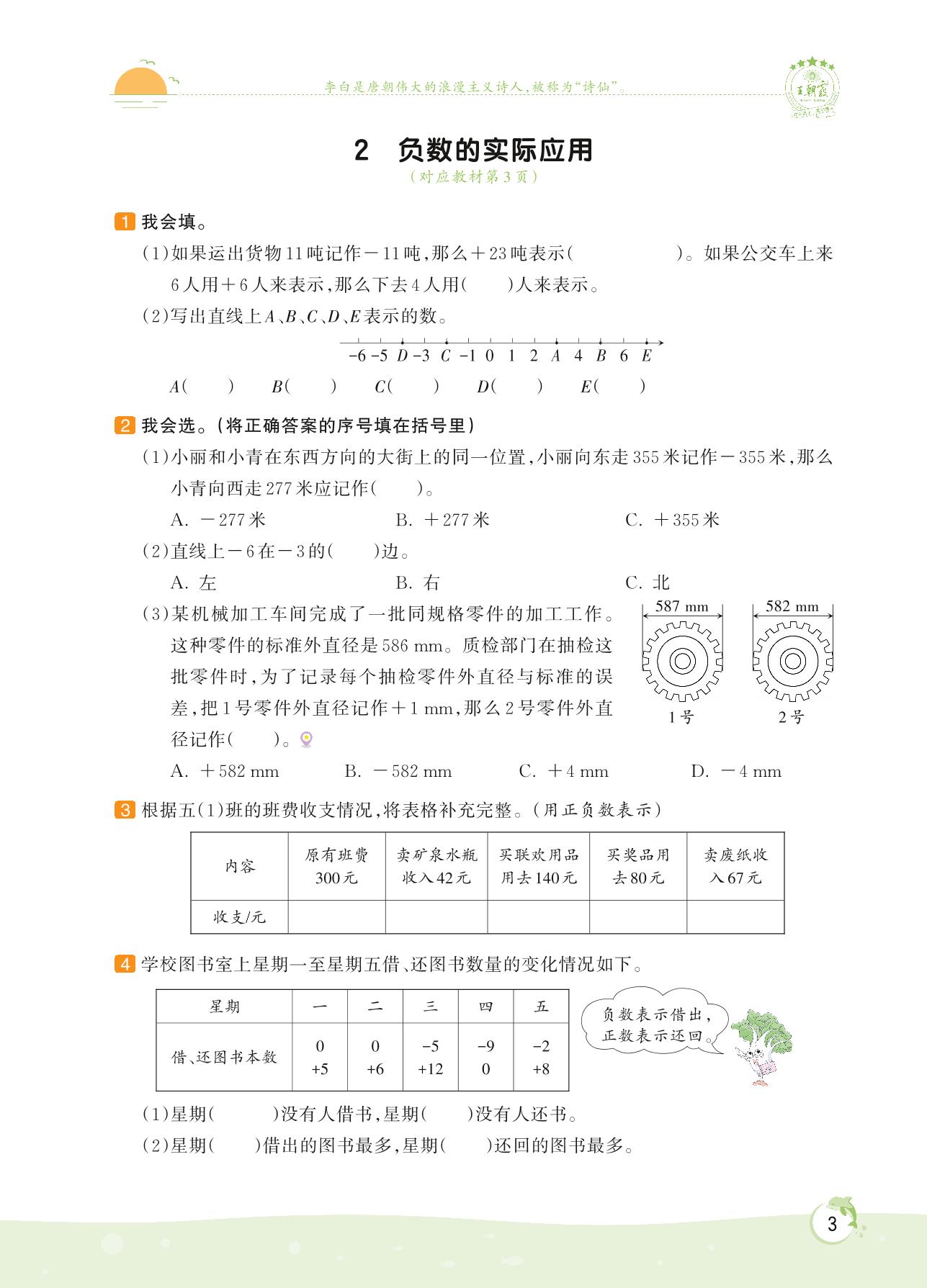 2022上册五年级数学苏教版 第一单元 负数的初步认识——2 负数的实际应用