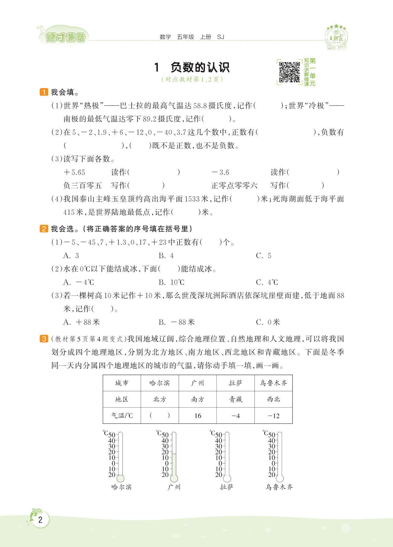 2022上册五年级数学苏教版 第一单元 负数的初步认识——1 负数的认识
