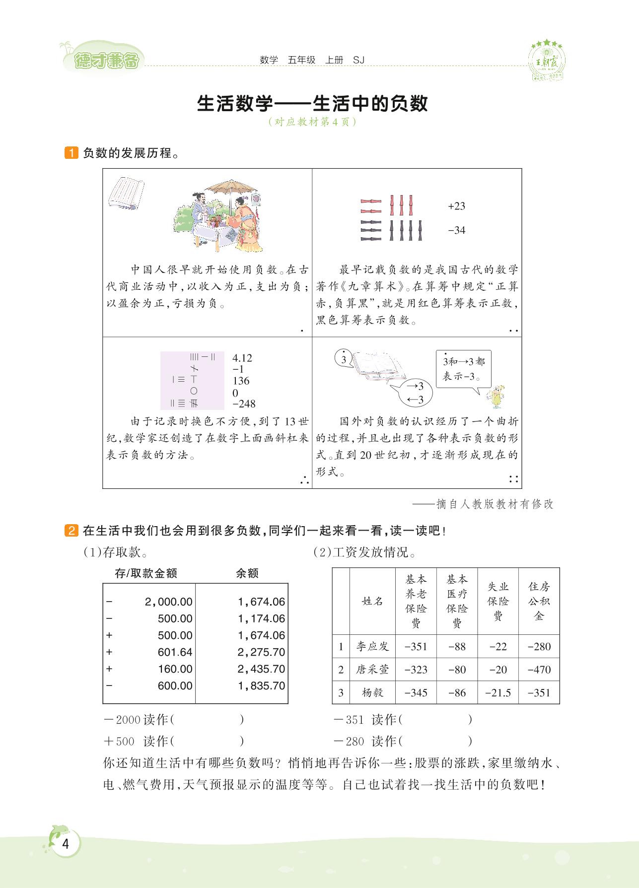 2022上册五年级数学苏教版 第一单元 负数的初步认识——生活数学 生活中的负数