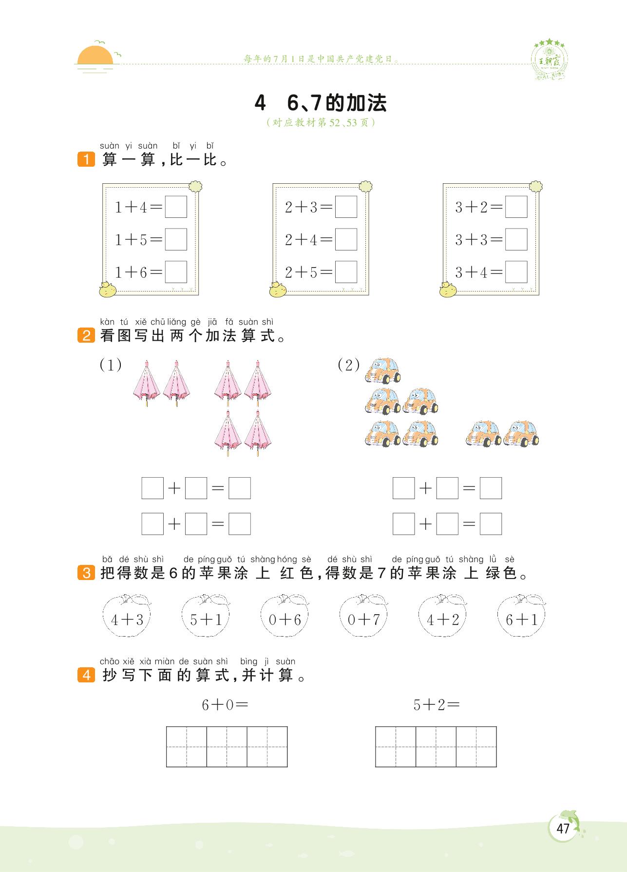 2022上册一年级数学苏教版 第八单元 10以内的加法和减法——4 6、7的加法