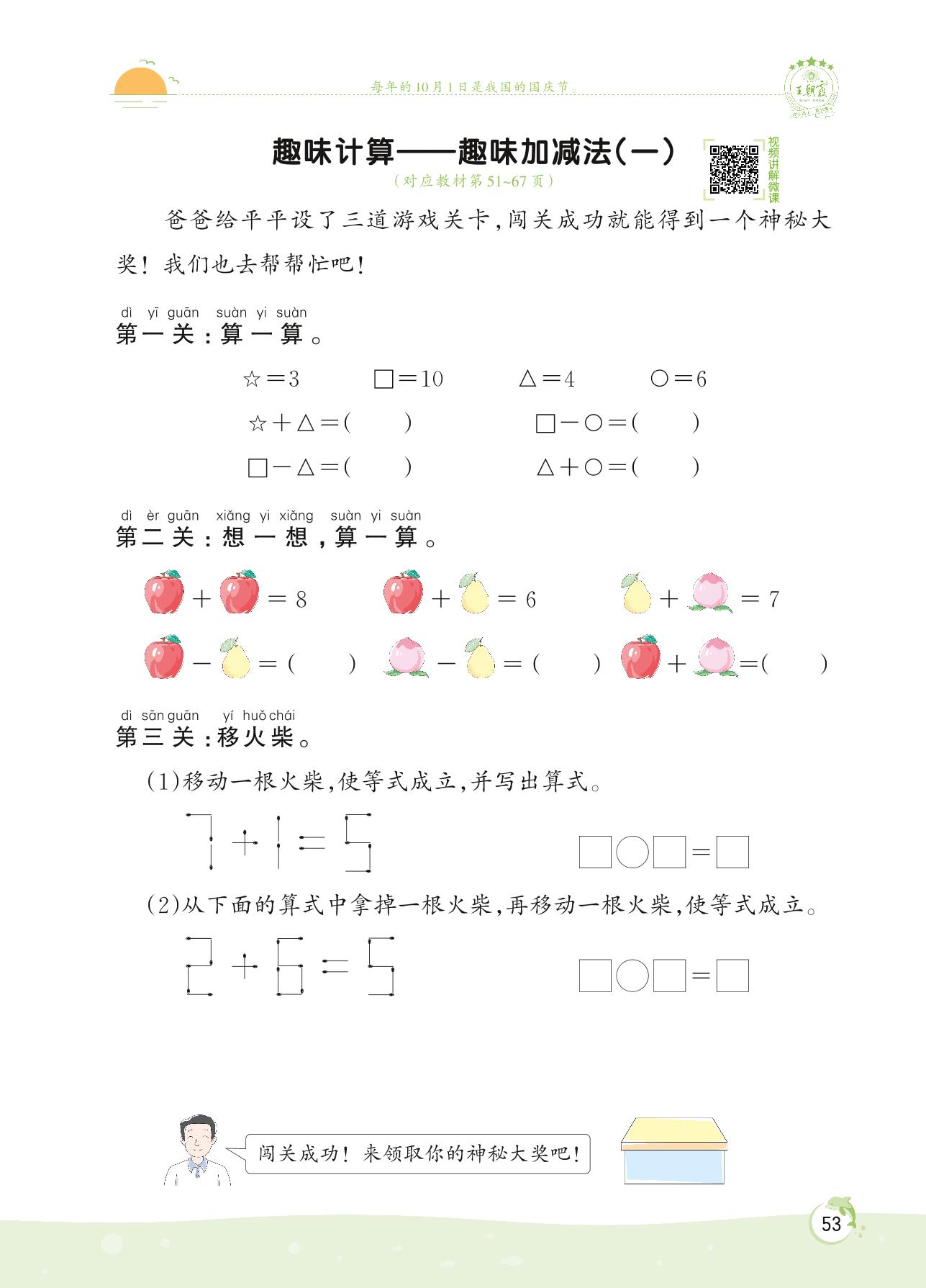 2022上册一年级数学苏教版 第八单元 10以内的加法和减法——趣味计算 趣味加减法(一)