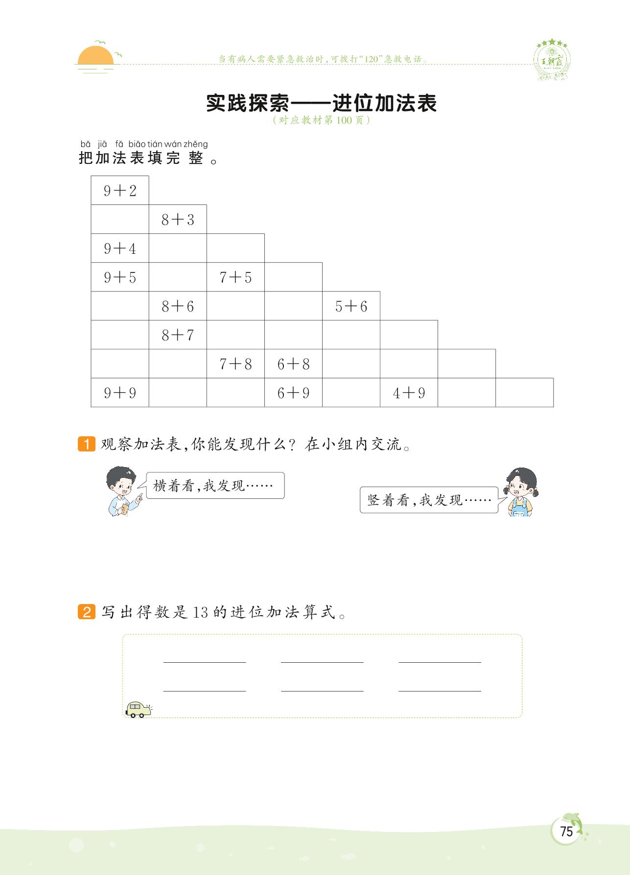2022上册一年级数学苏教版 第十单元 20以内的进位加法——实践探索 进位加法表