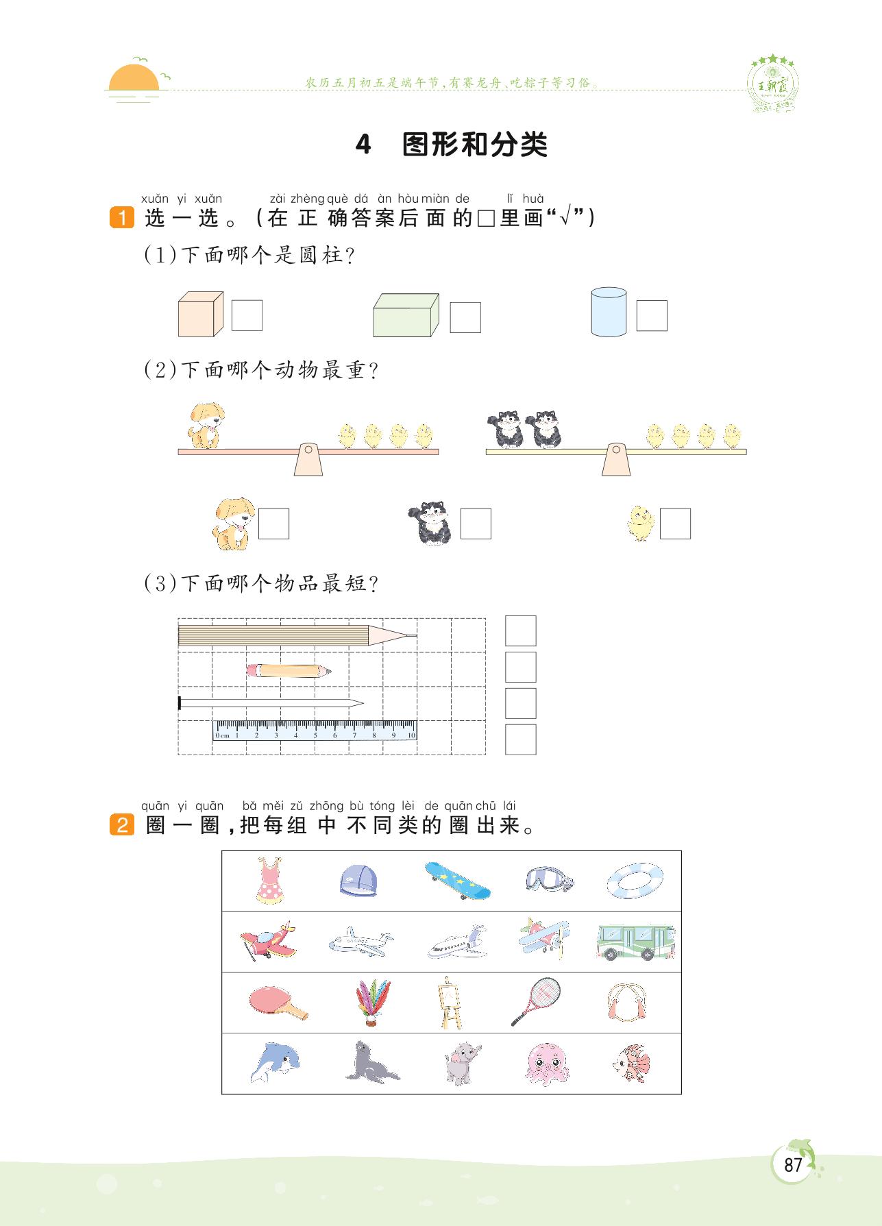 2022上册一年级数学苏教版 第十一单元 期末复习——4 图形和分类