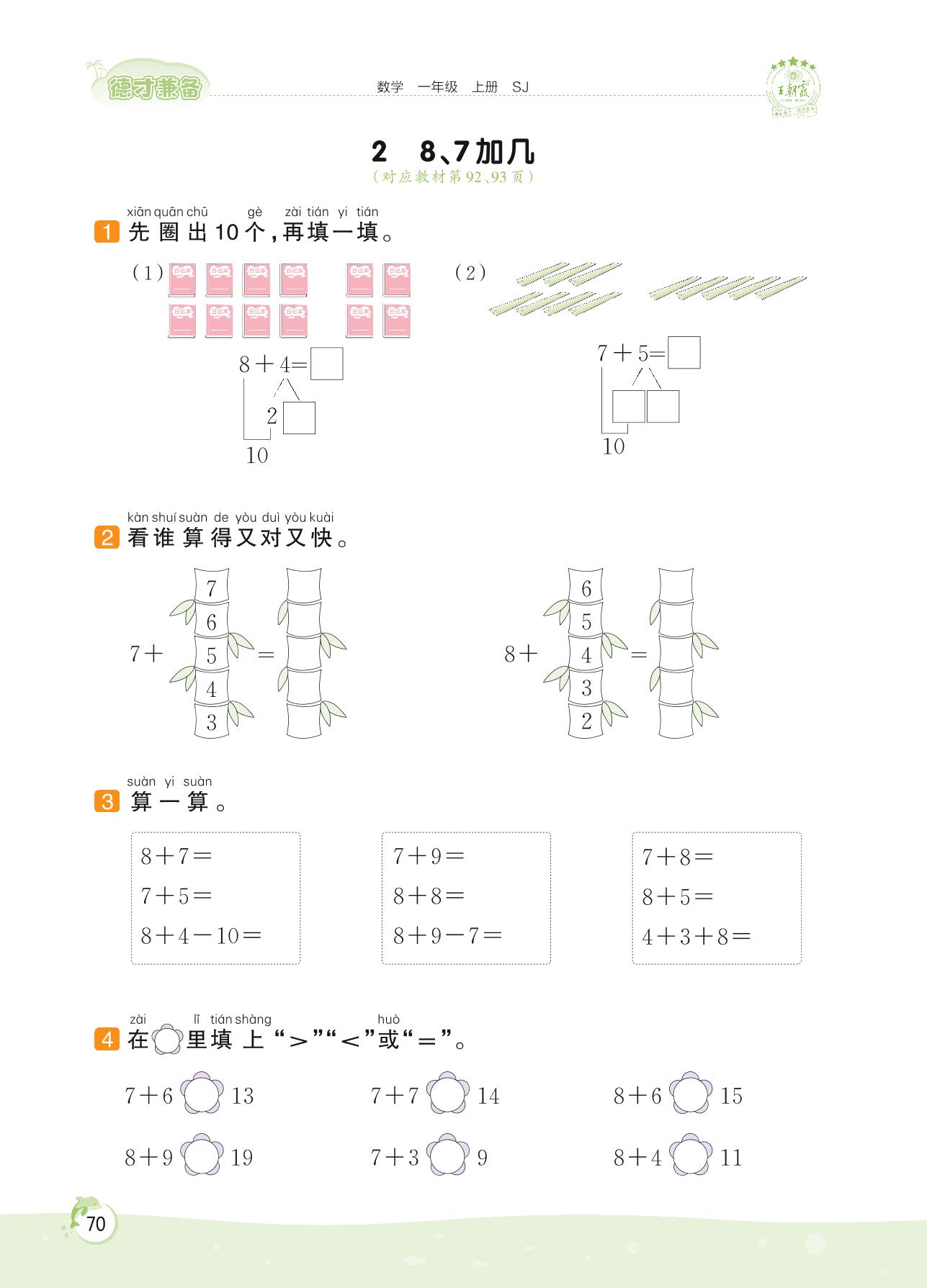 2022上册一年级数学苏教版 第十单元 20以内的进位加法——2 8、7加几