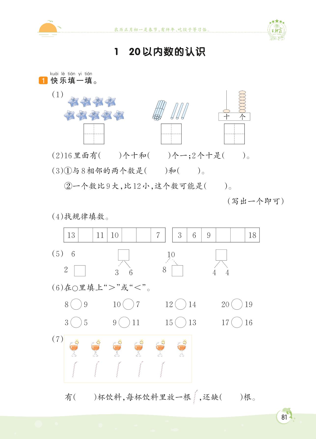 2022上册一年级数学苏教版 第十一单元 期末复习——1 20以内数的认识