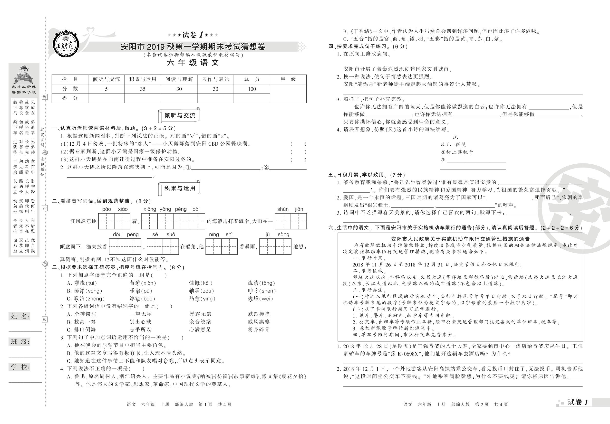 2019-2020学年第一学期安阳市猜想卷六年级语文试卷(人教版)【1】