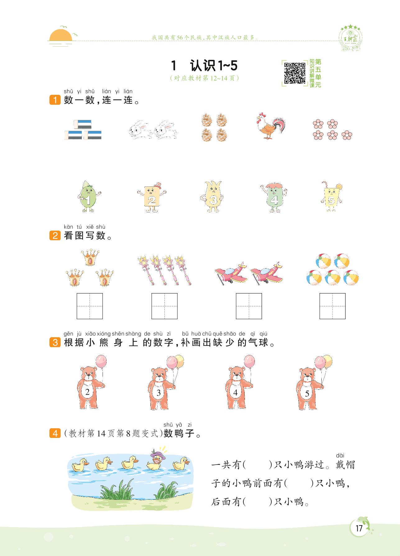 2022上册一年级数学苏教版 第五单元 认识10以内的数——1 认识1~5