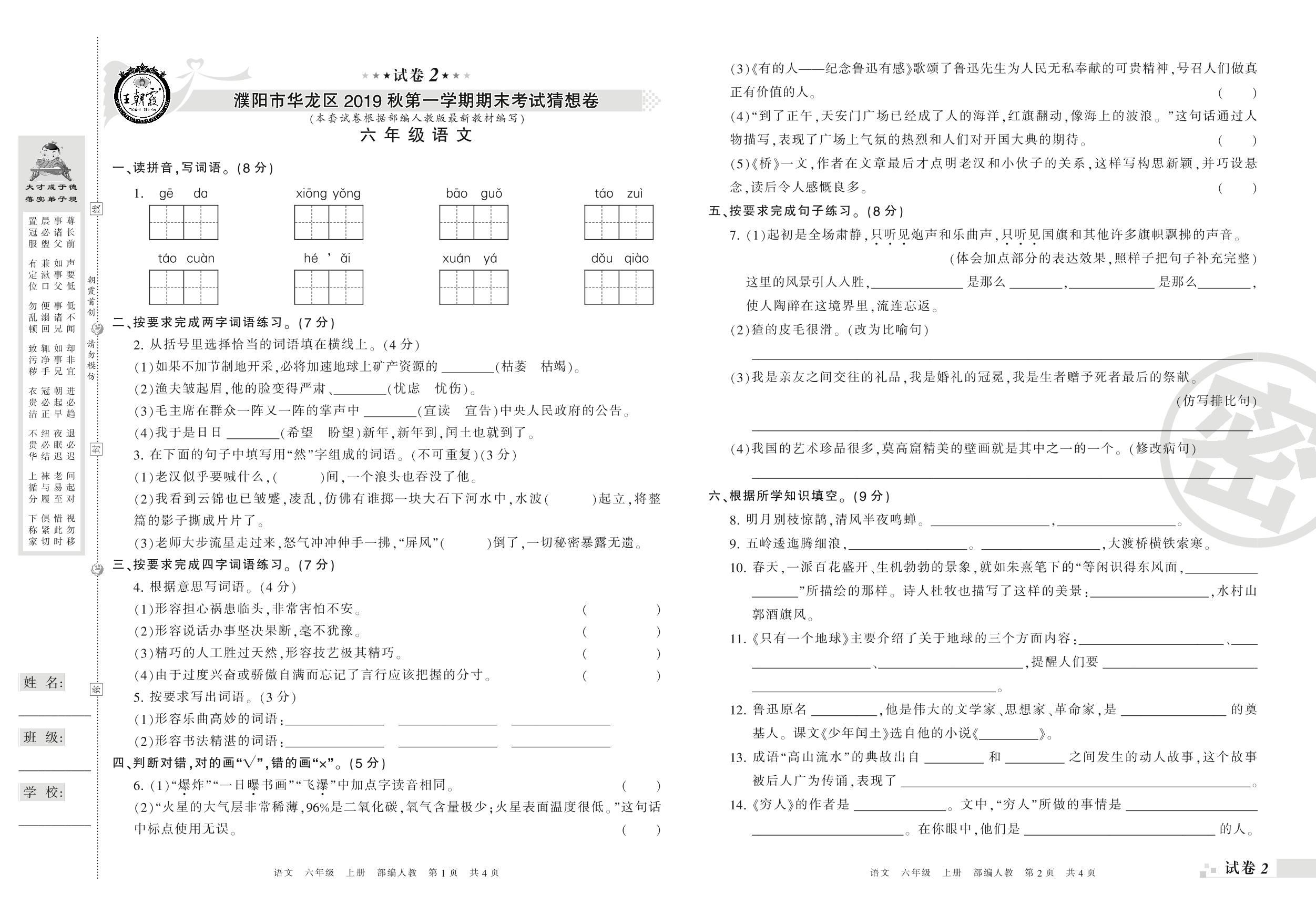 2019-2020学年第一学期濮阳市华龙区猜想卷六年级语文试卷(人教版)【2】