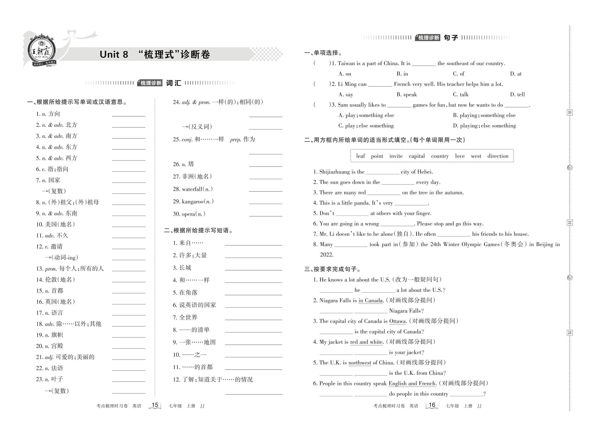 2022上册七年级英语冀教版 Unit 8 “梳理式”诊断卷