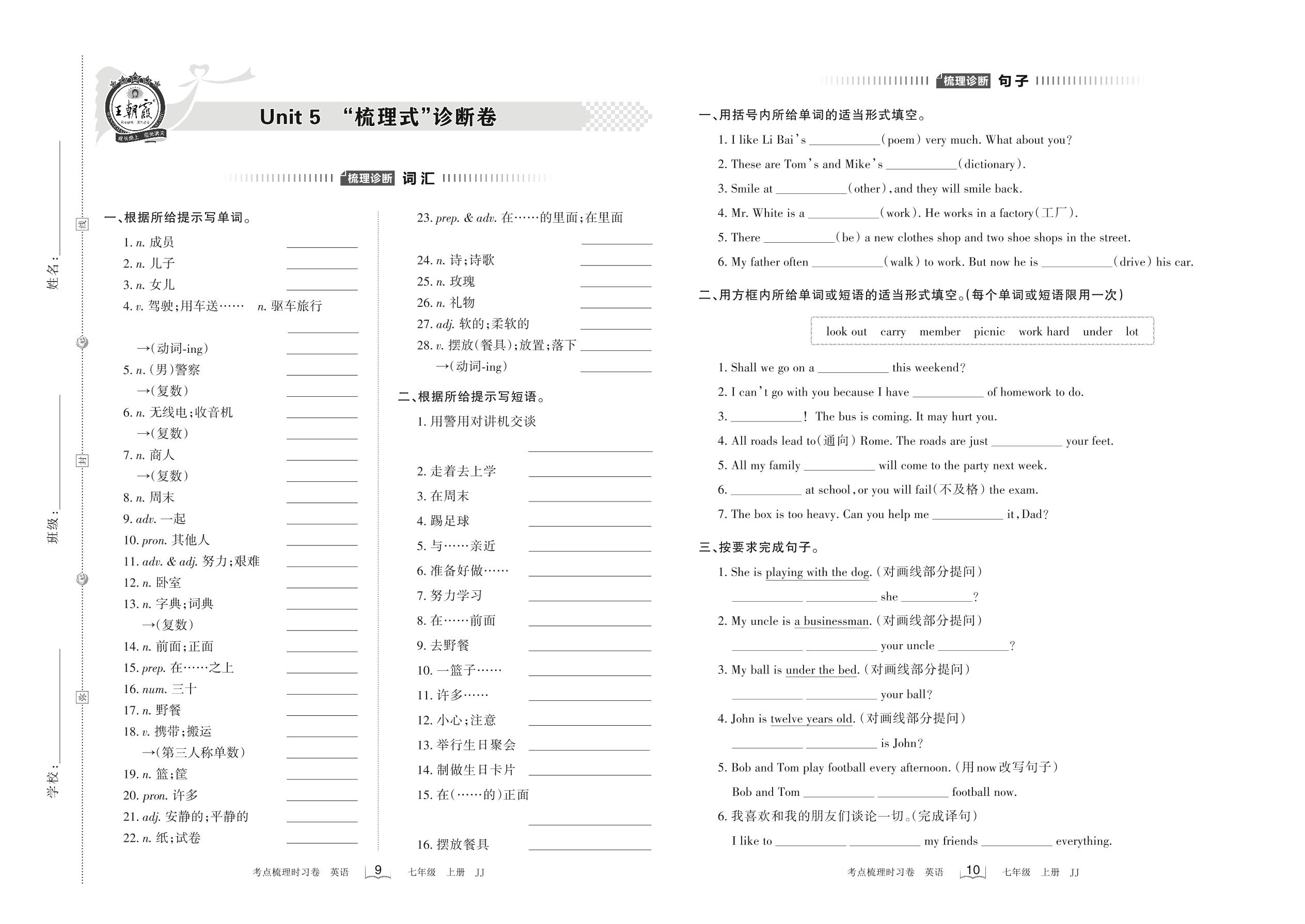 2022上册七年级英语冀教版 Unit 5 “梳理式”诊断卷