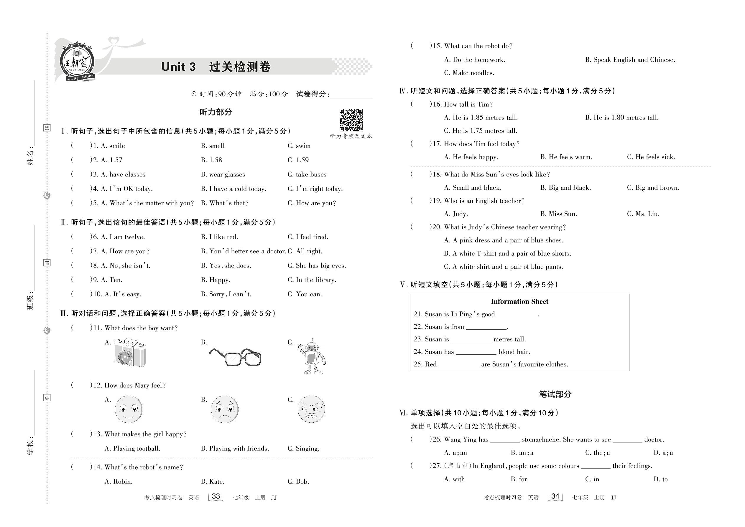 2022上册七年级英语冀教版 Unit 3 过关检测卷