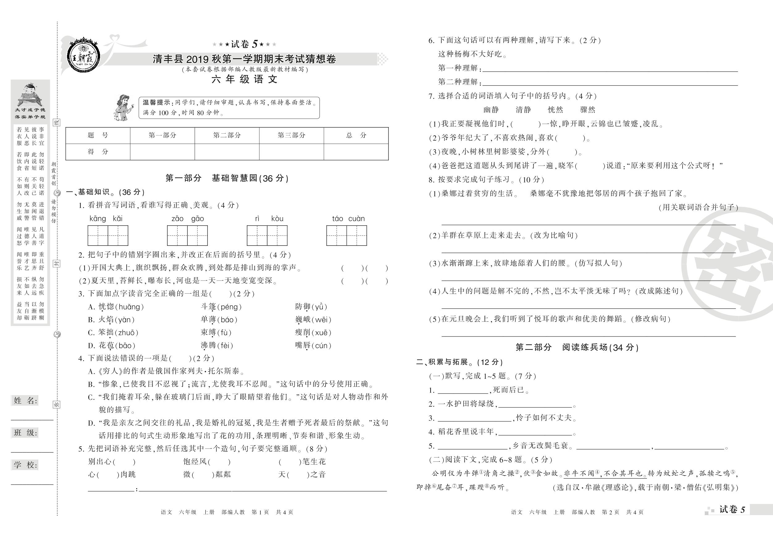 2019-2020学年第一学期濮阳市清丰县猜想卷六年级语文试卷(人教版)【5】