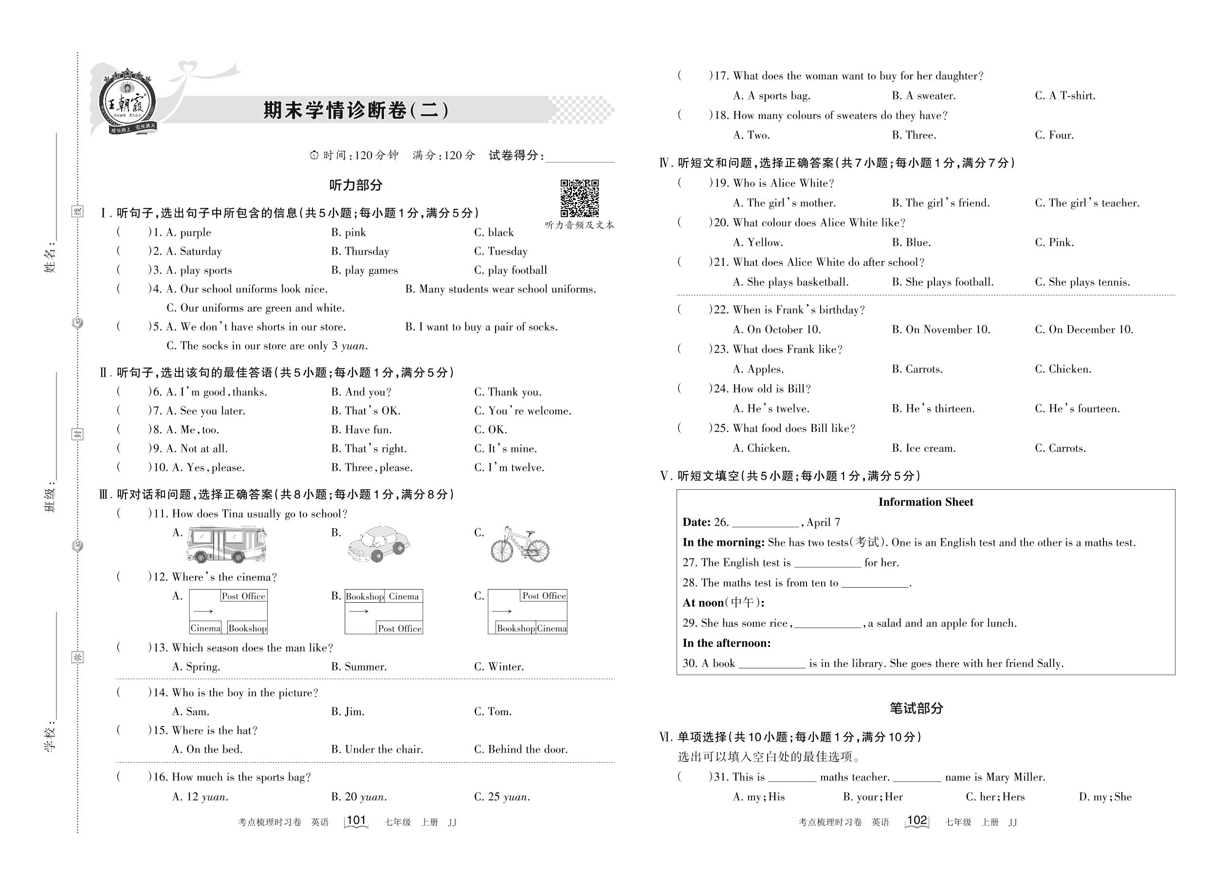 2022上册七年级英语冀教版 期末学情诊断卷(二)