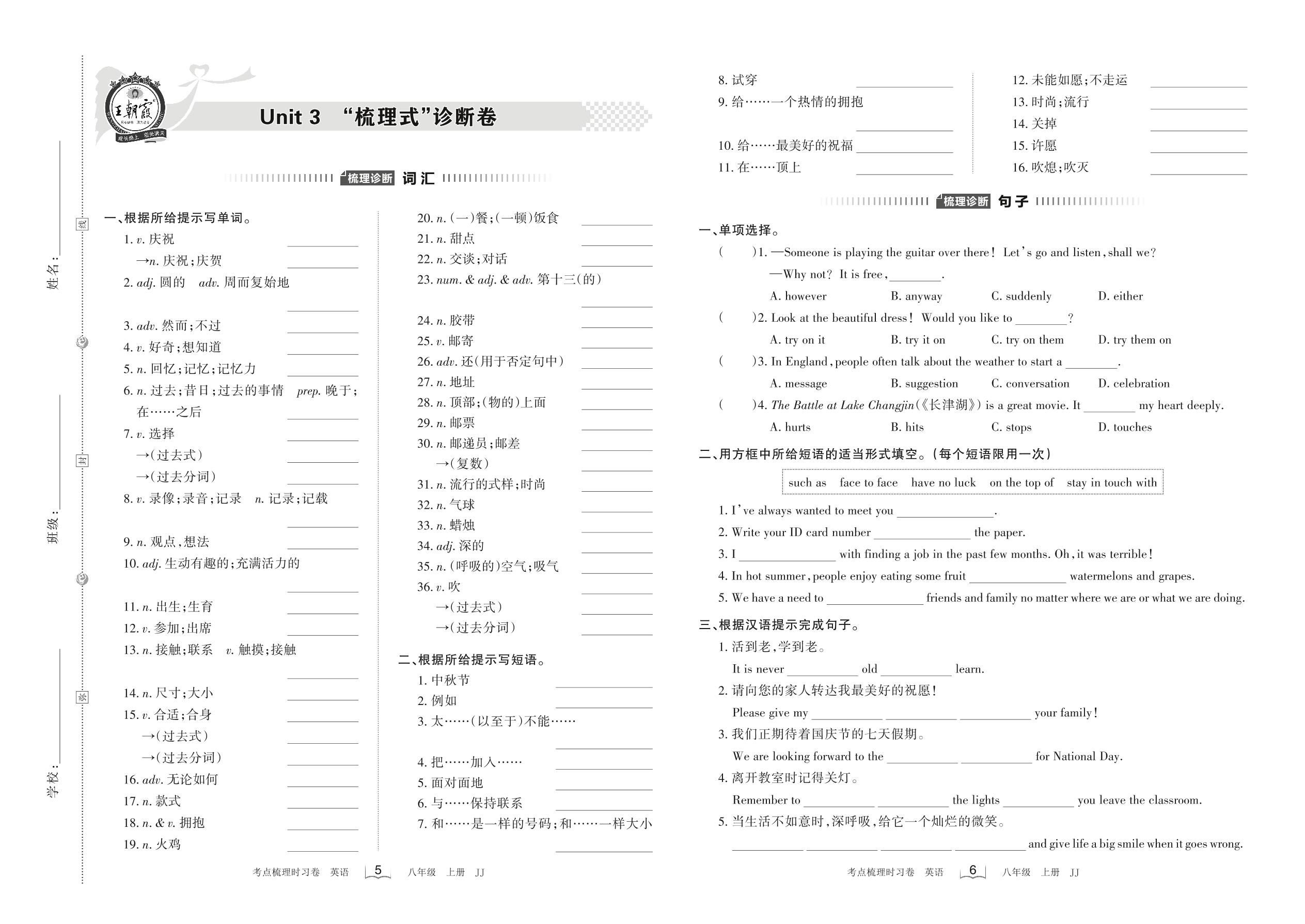 2022上册八年级英语冀教版 Unit 3 “梳理式”诊断卷