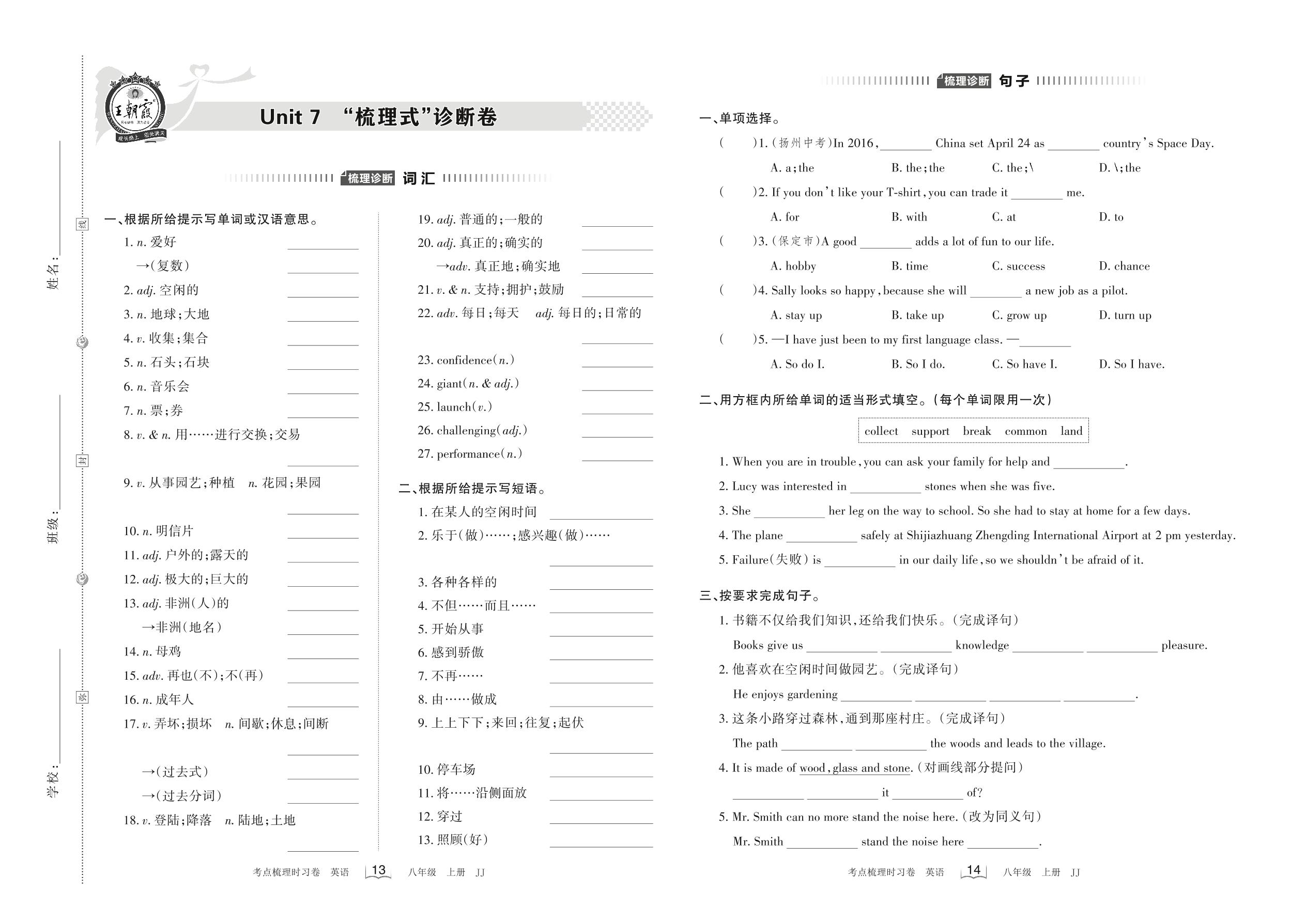 2022上册八年级英语冀教版 Unit 7 “梳理式”诊断卷