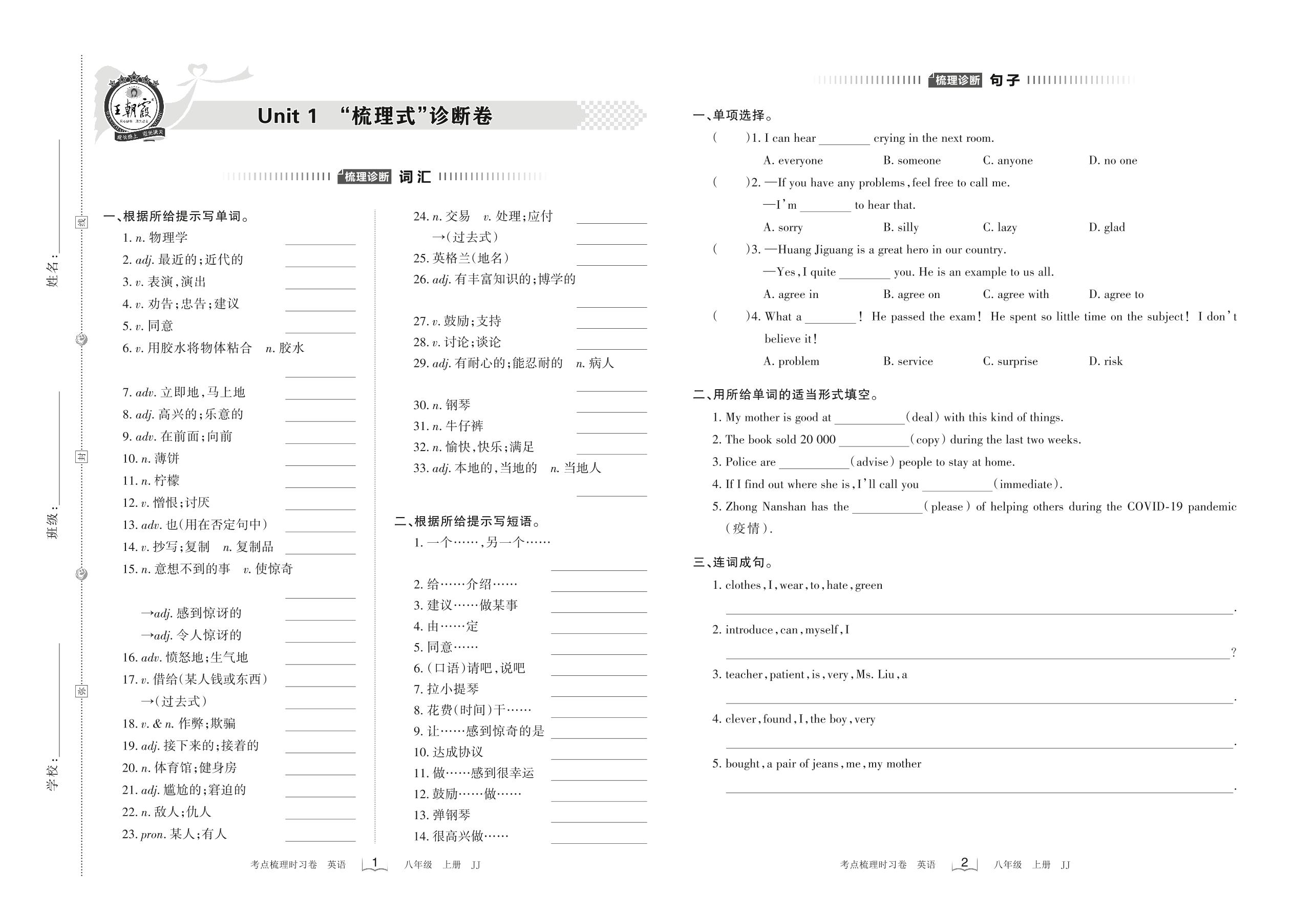 2022上册八年级英语冀教版 Unit 1 “梳理式”诊断卷