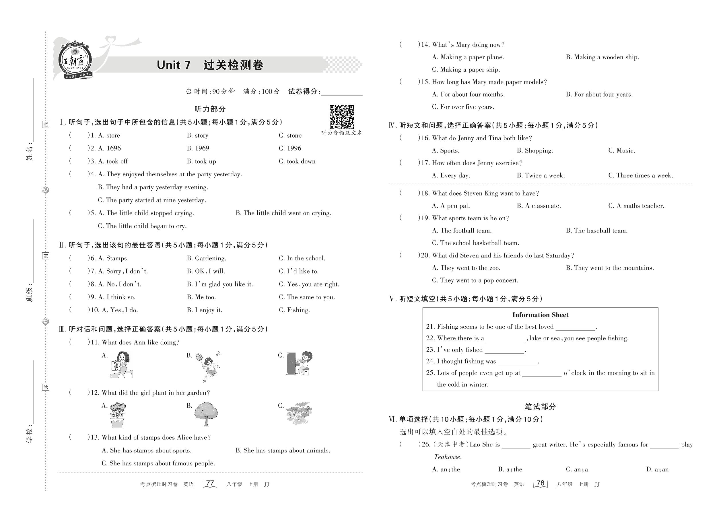 2022上册八年级英语冀教版 Unit 7 过关检测卷
