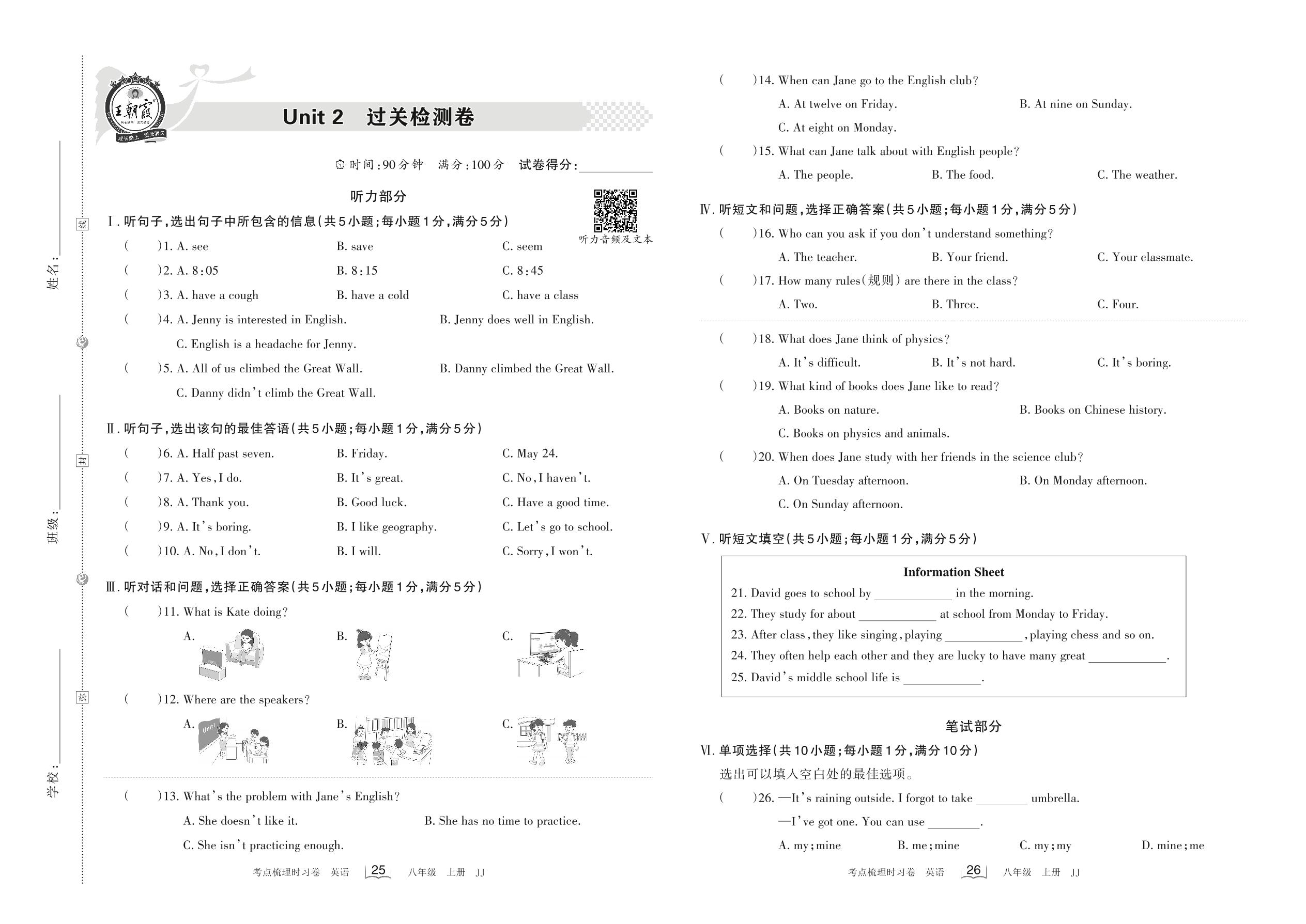 2022上册八年级英语冀教版 Unit 2 过关检测卷