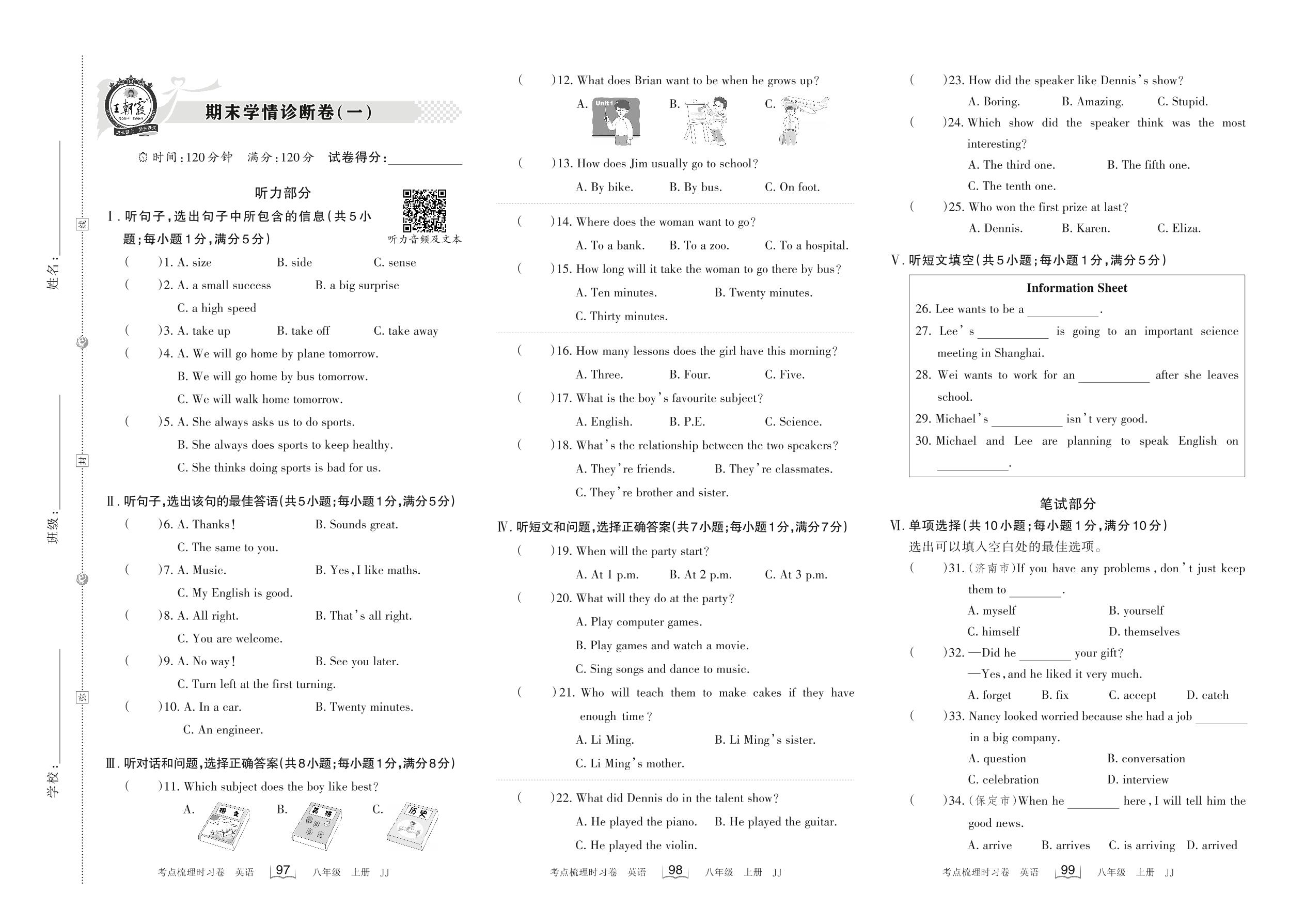 八年级英语冀教版上册期末卷