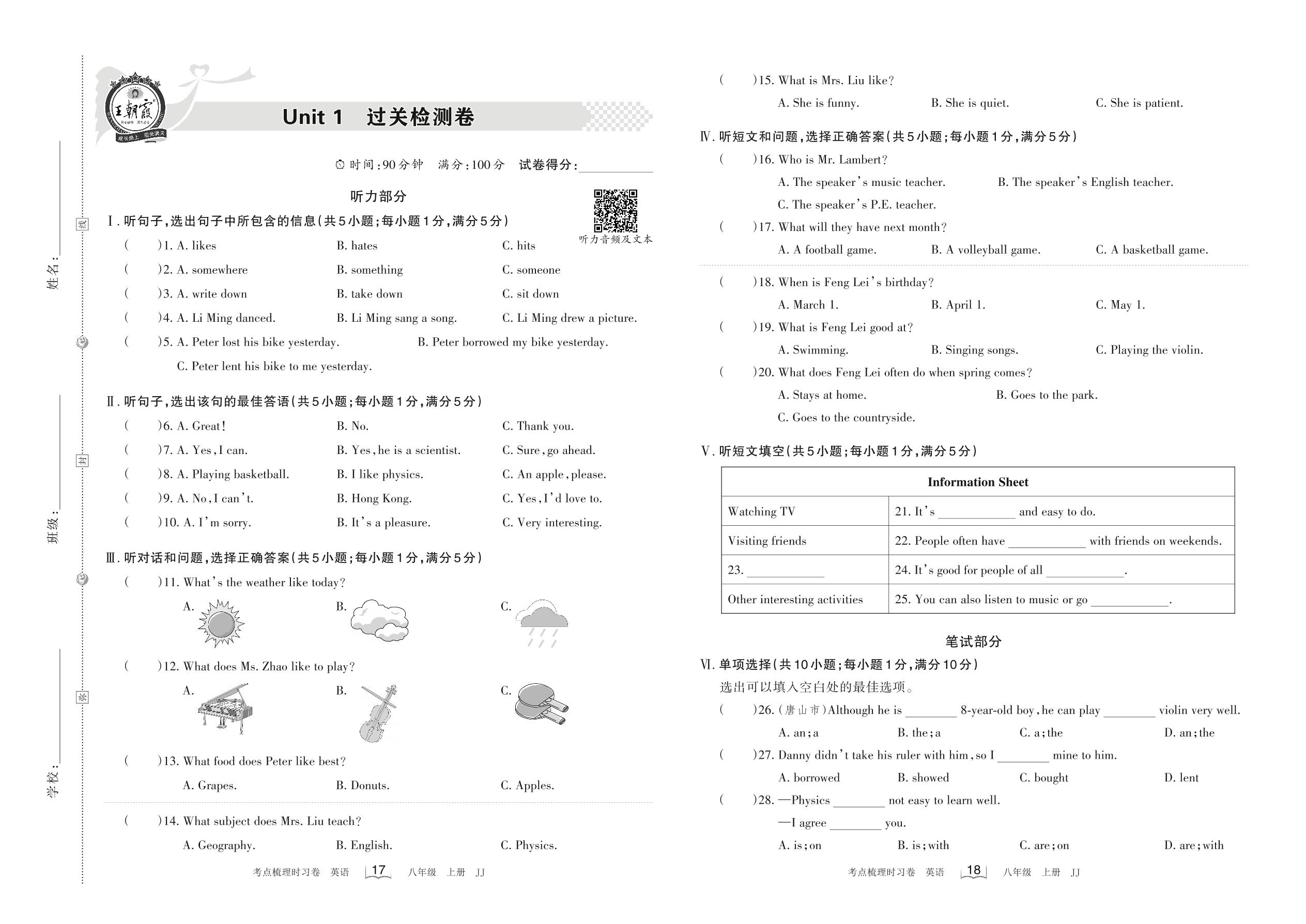 八年级英语冀教版上册单元卷