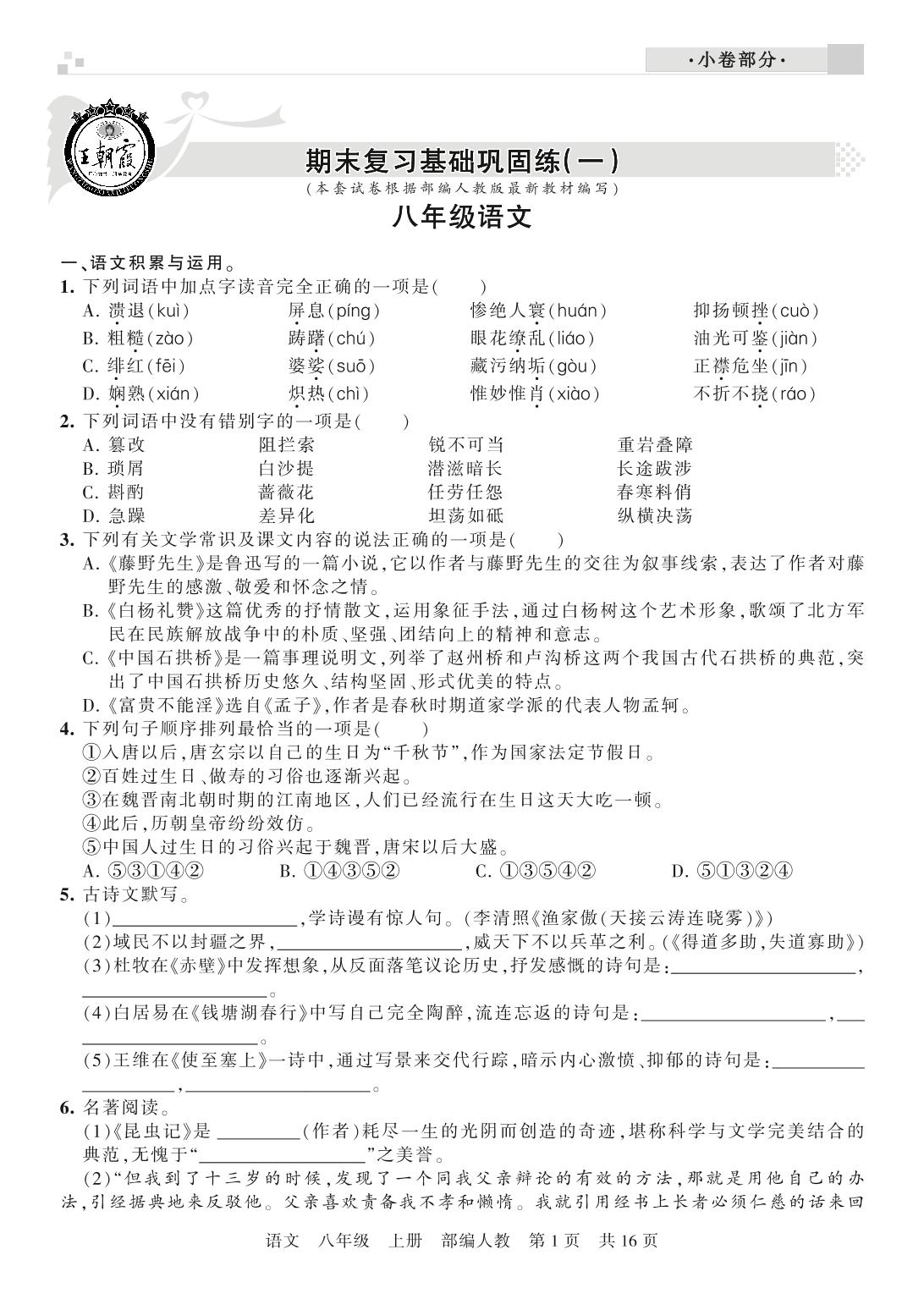 王朝霞期末小卷——期末复习基础巩固练八年级上册语文(人教版)_R21080241843【0】