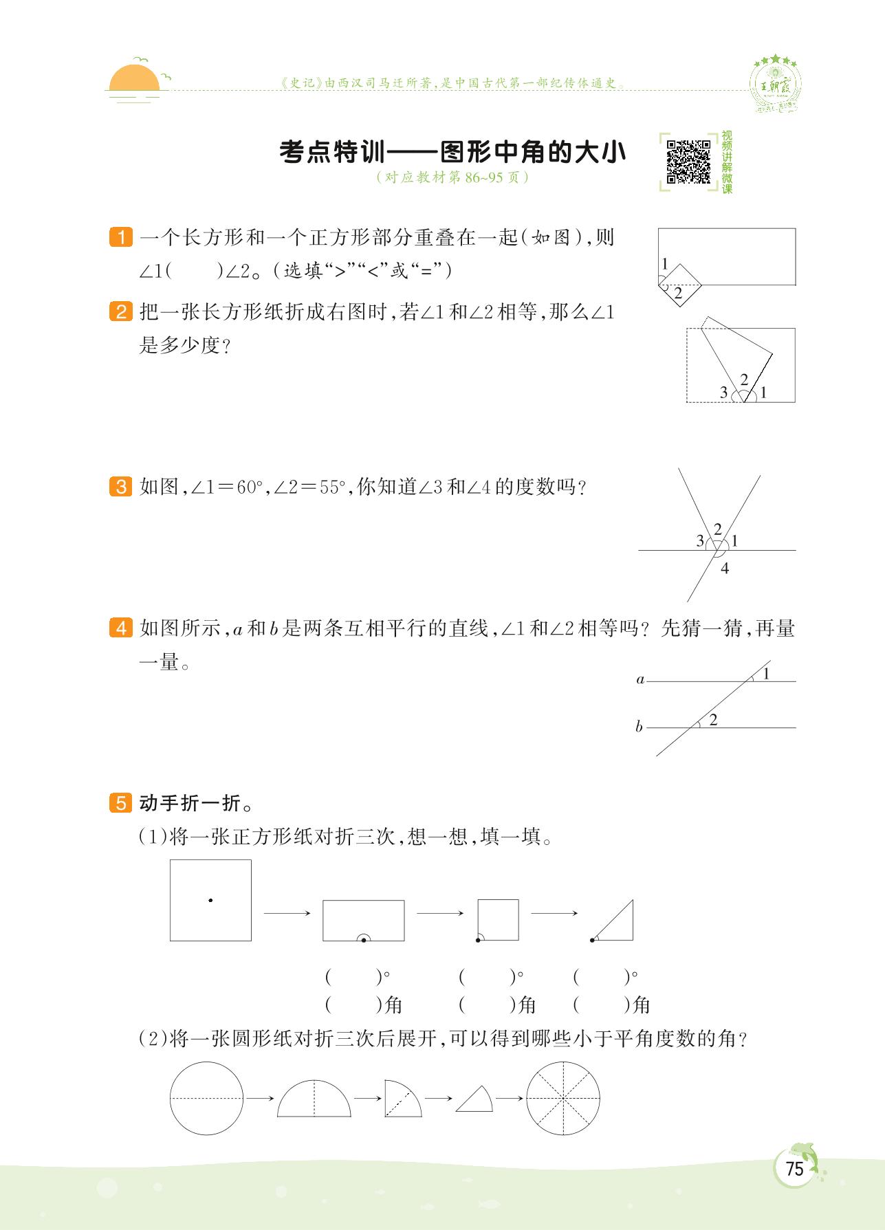 2022上册四年级数学苏教版 第八单元 垂线与平行线——考点特训 图形中角的大小