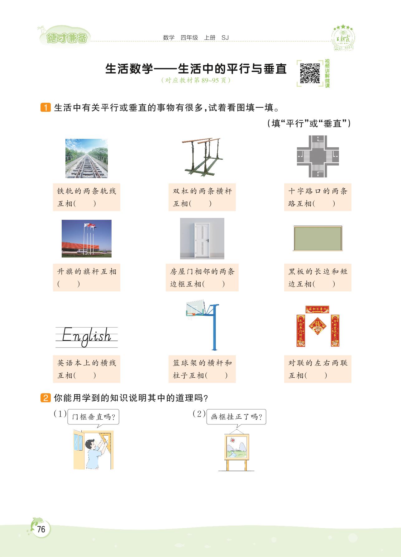 2022上册四年级数学苏教版 第八单元 垂线与平行线——生活数学 生活中的平行与垂直