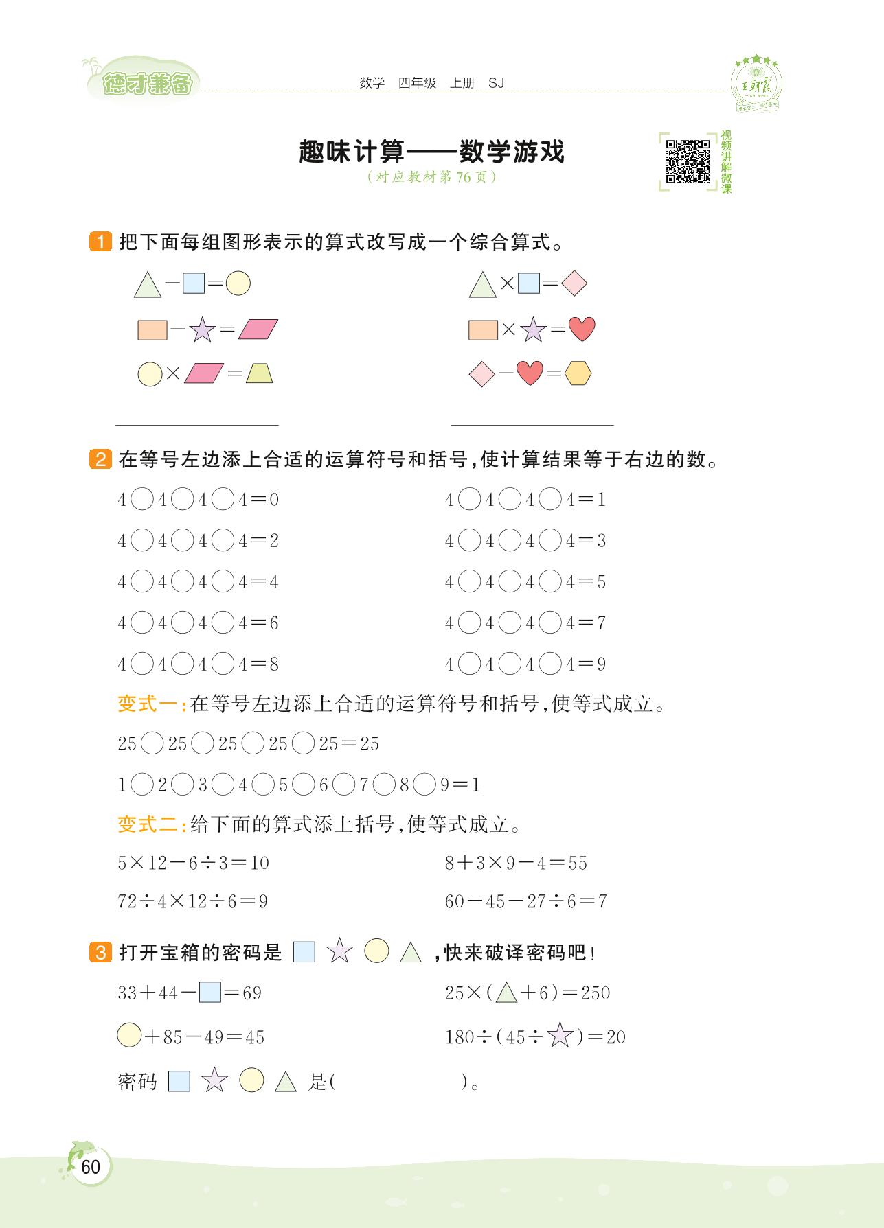 2022上册四年级数学苏教版 第七单元 整数四则混合运算——趣味计算 数学游戏
