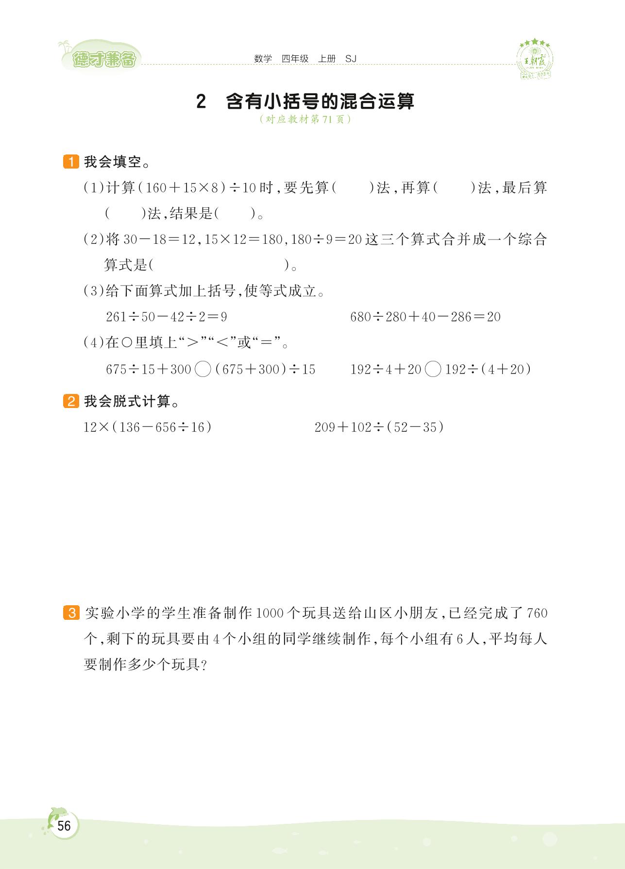 2022上册四年级数学苏教版 第七单元 整数四则混合运算——2 含有小括号的混合运算