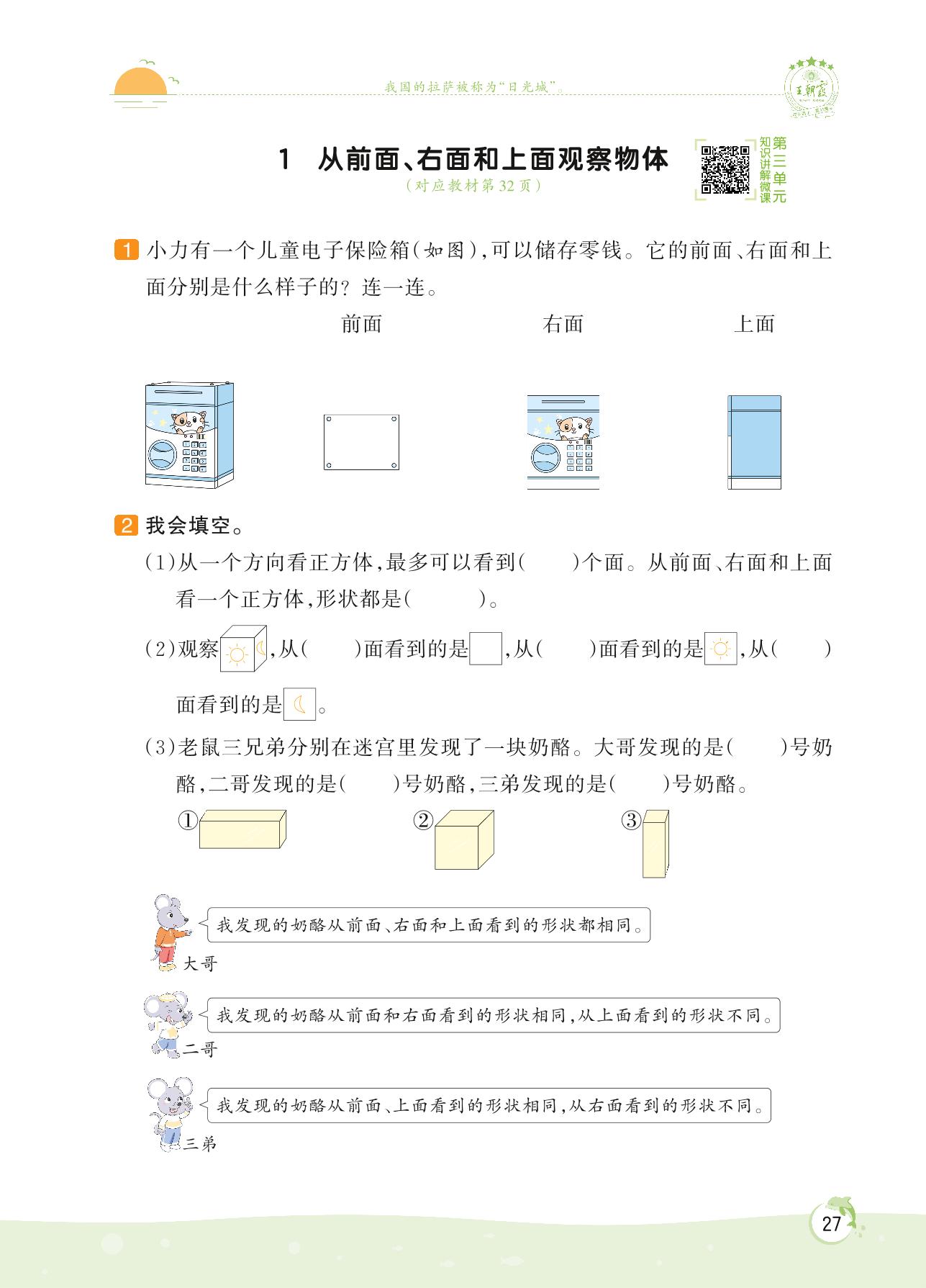 2022上册四年级数学苏教版 第三单元 观察物体——1 从前面、右面和上面观察物体