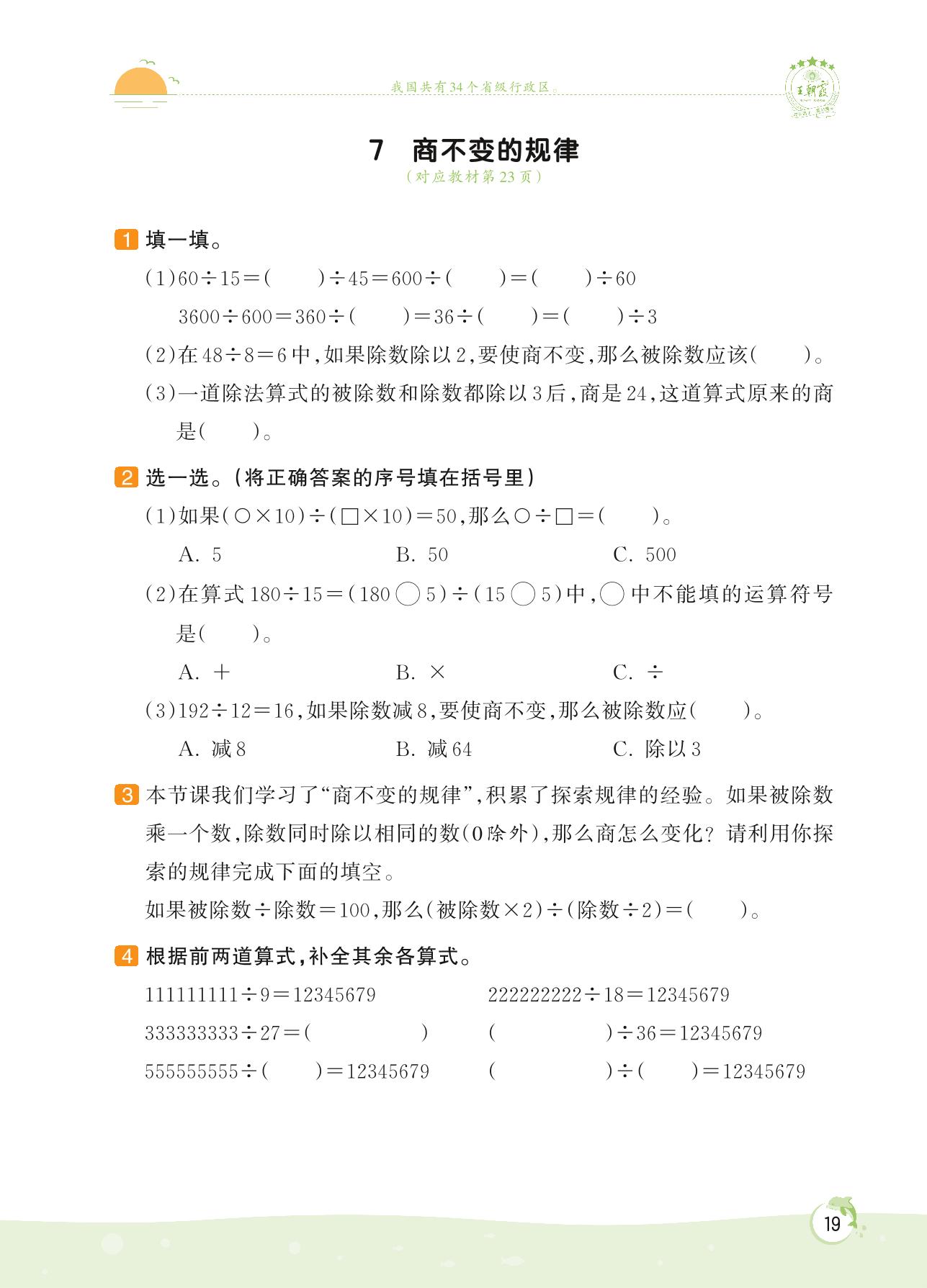2022上册四年级数学苏教版 第二单元 两、三位数除以两位数——7 商不变的规律