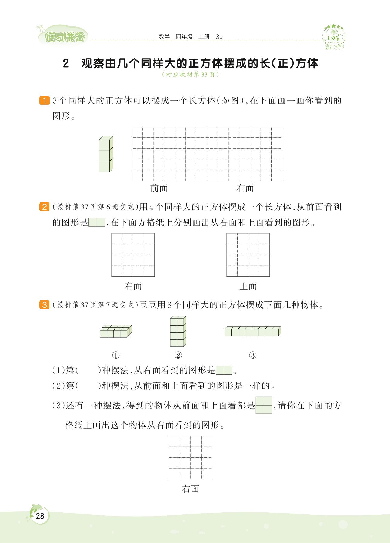 2022上册四年级数学苏教版 第三单元 观察物体——2 观察由几个同样大的正方体摆成的长(正)方体