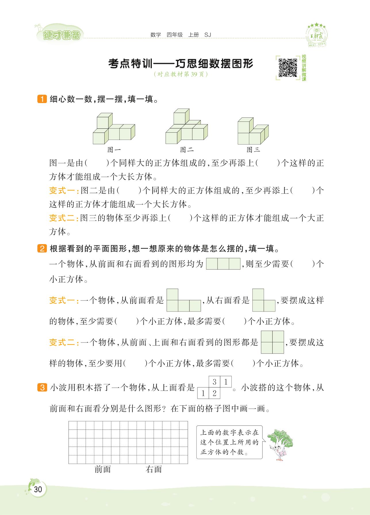 2022上册四年级数学苏教版 第三单元 观察物体——考点特训 巧思细数摆图形