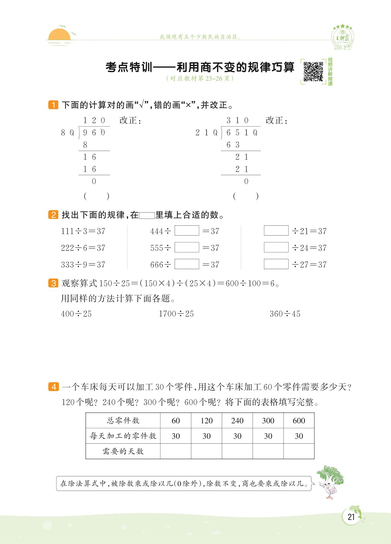 2022上册四年级数学苏教版 第二单元 两、三位数除以两位数——考点特训 利用商不变的规律巧算
