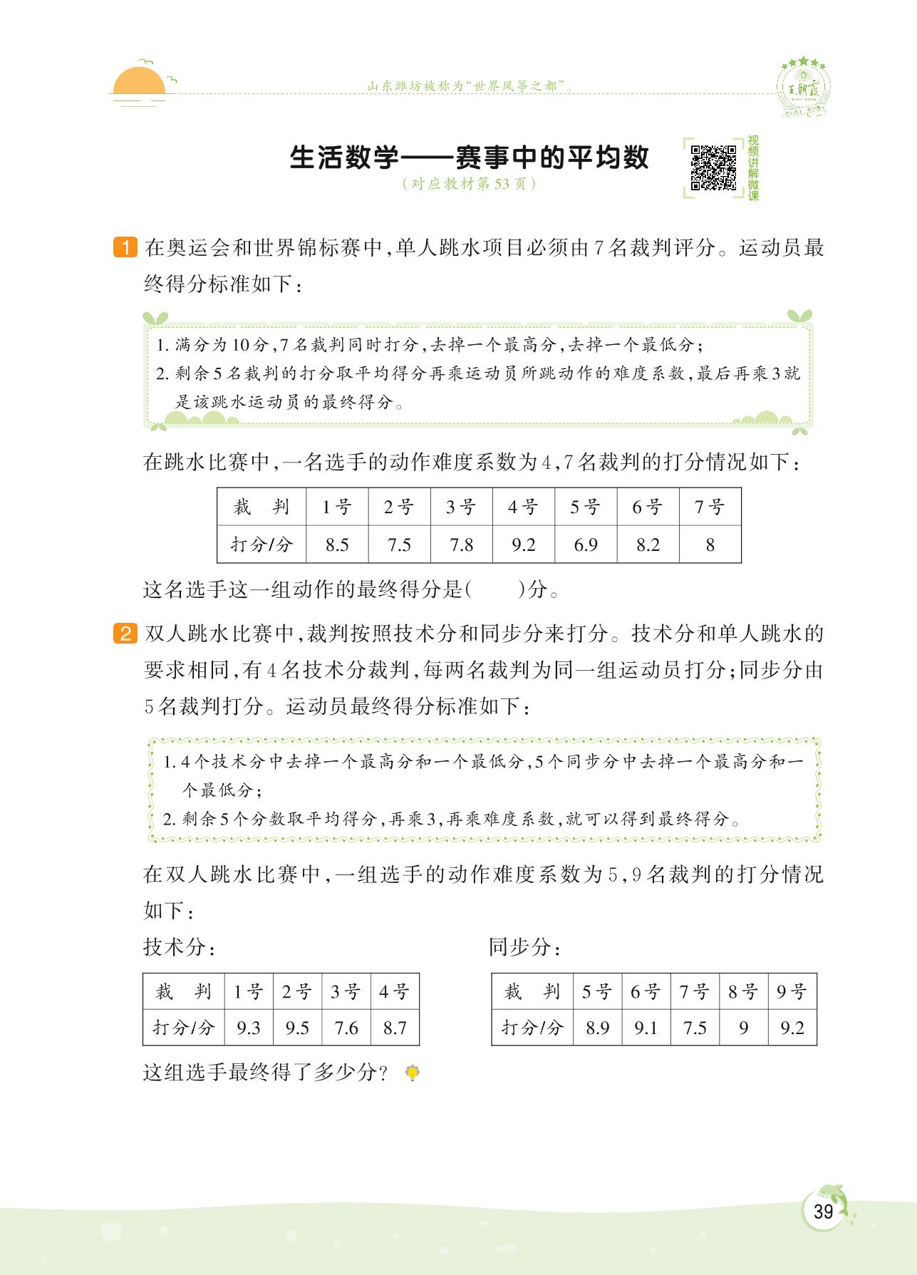 2022上册四年级数学苏教版 第四单元 统计表和条形统计图(一)——生活数学 赛事中的平均数