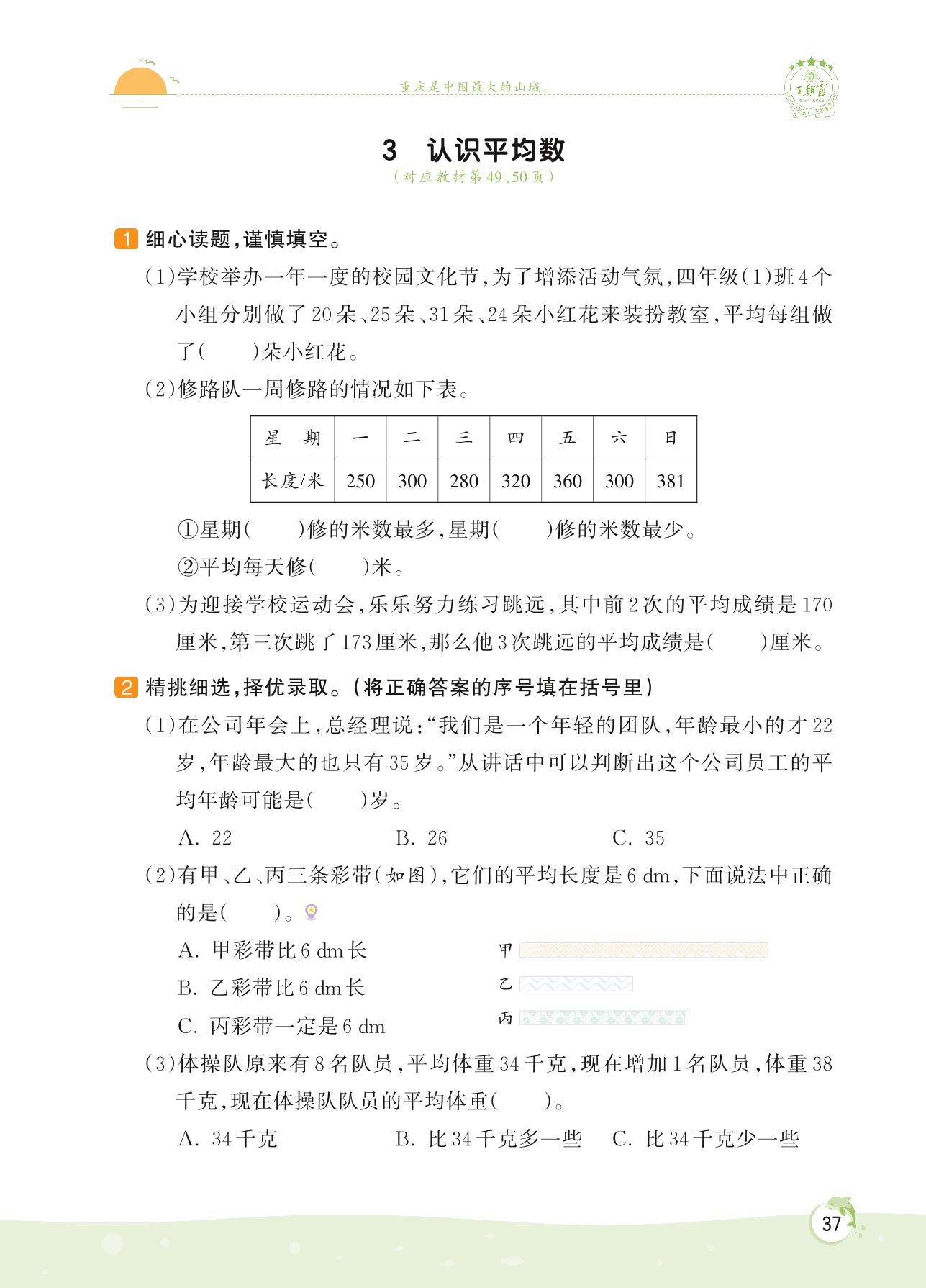 2022上册四年级数学苏教版 第四单元 统计表和条形统计图(一)——3 认识平均数