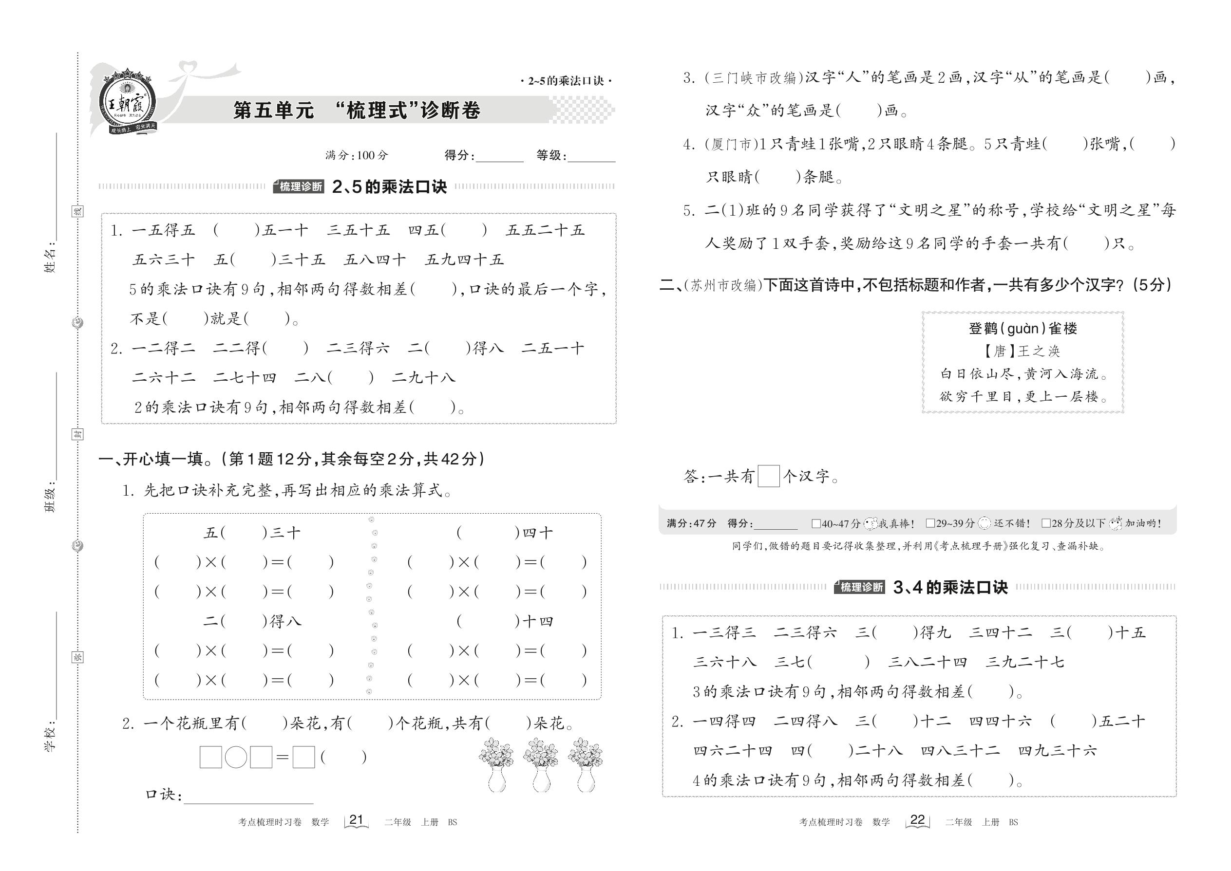 2022上册二年级数学北师版 第五单元 “梳理式”诊断卷