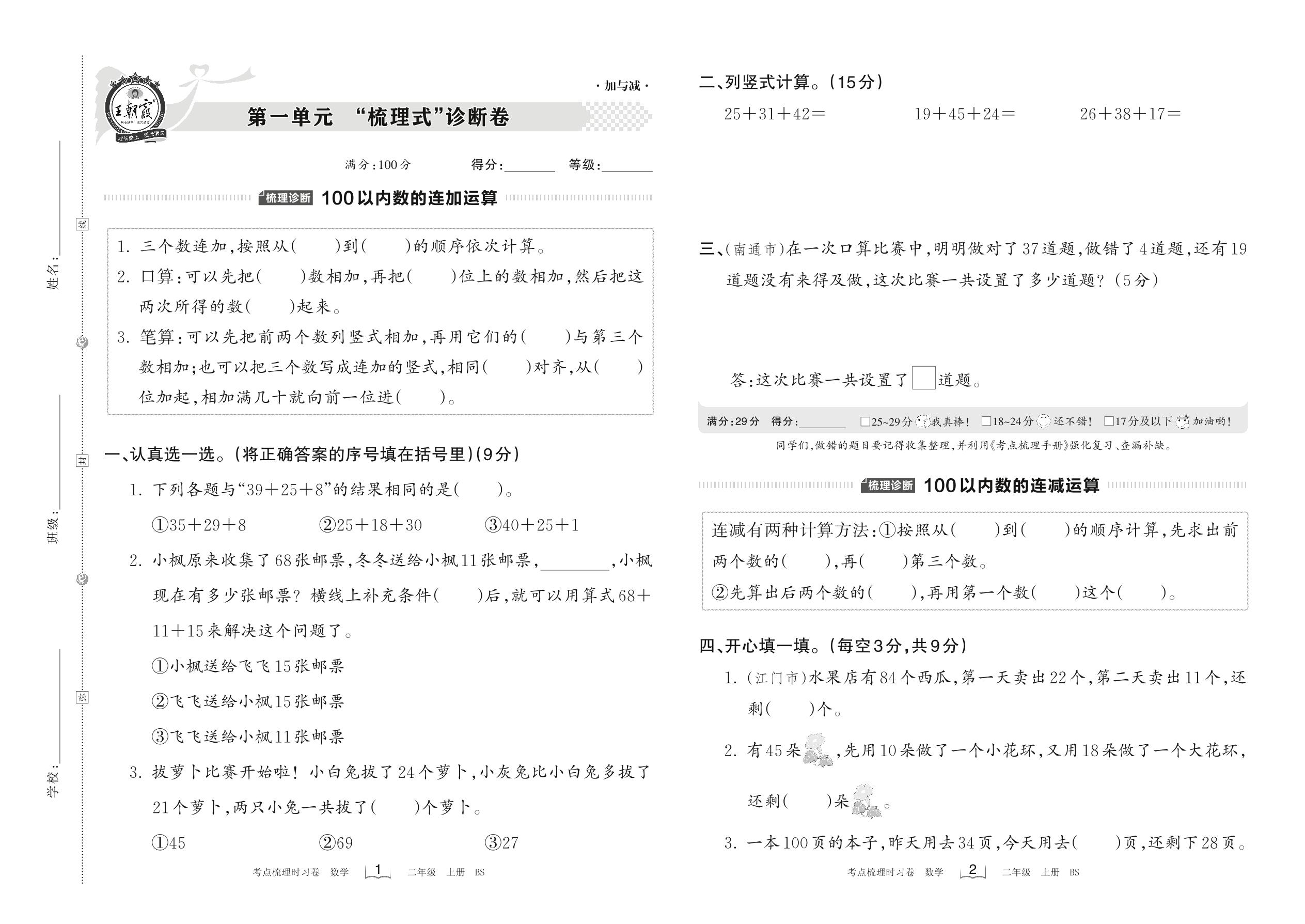 2022上册二年级数学北师版 第一单元 “梳理式”诊断卷