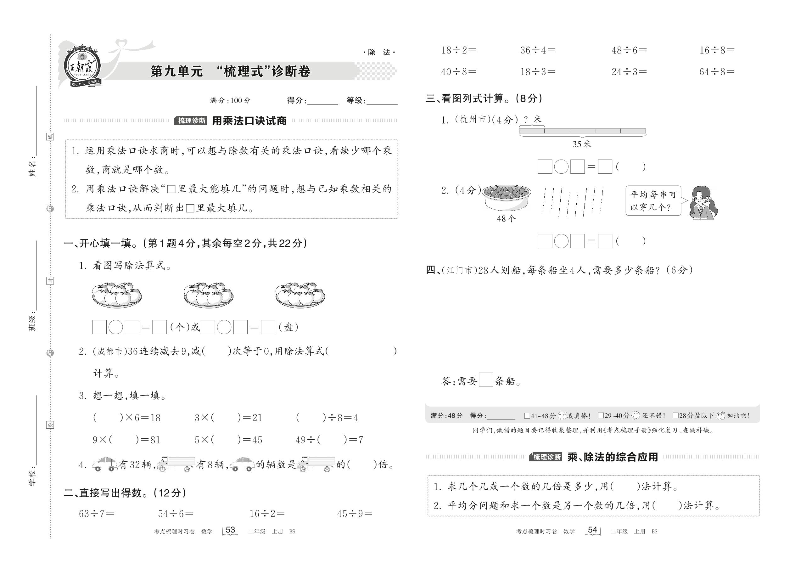 2022上册二年级数学北师版 第九单元 “梳理式”诊断卷