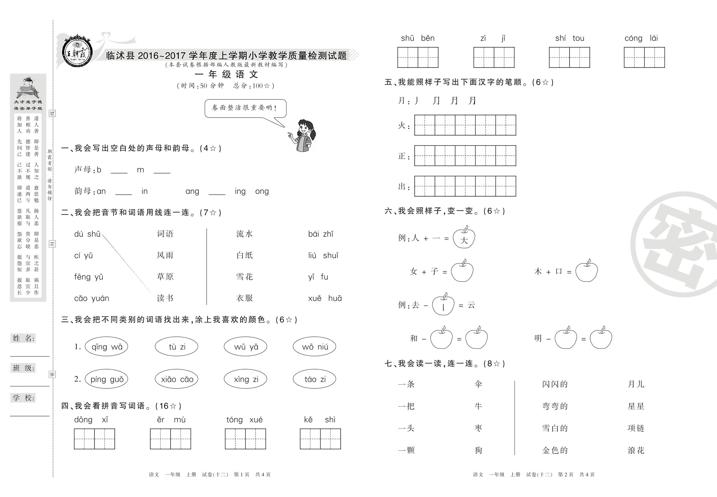 2016-2017学年第一学期临沂市临沭县一年级语文试卷(人教版)【12】