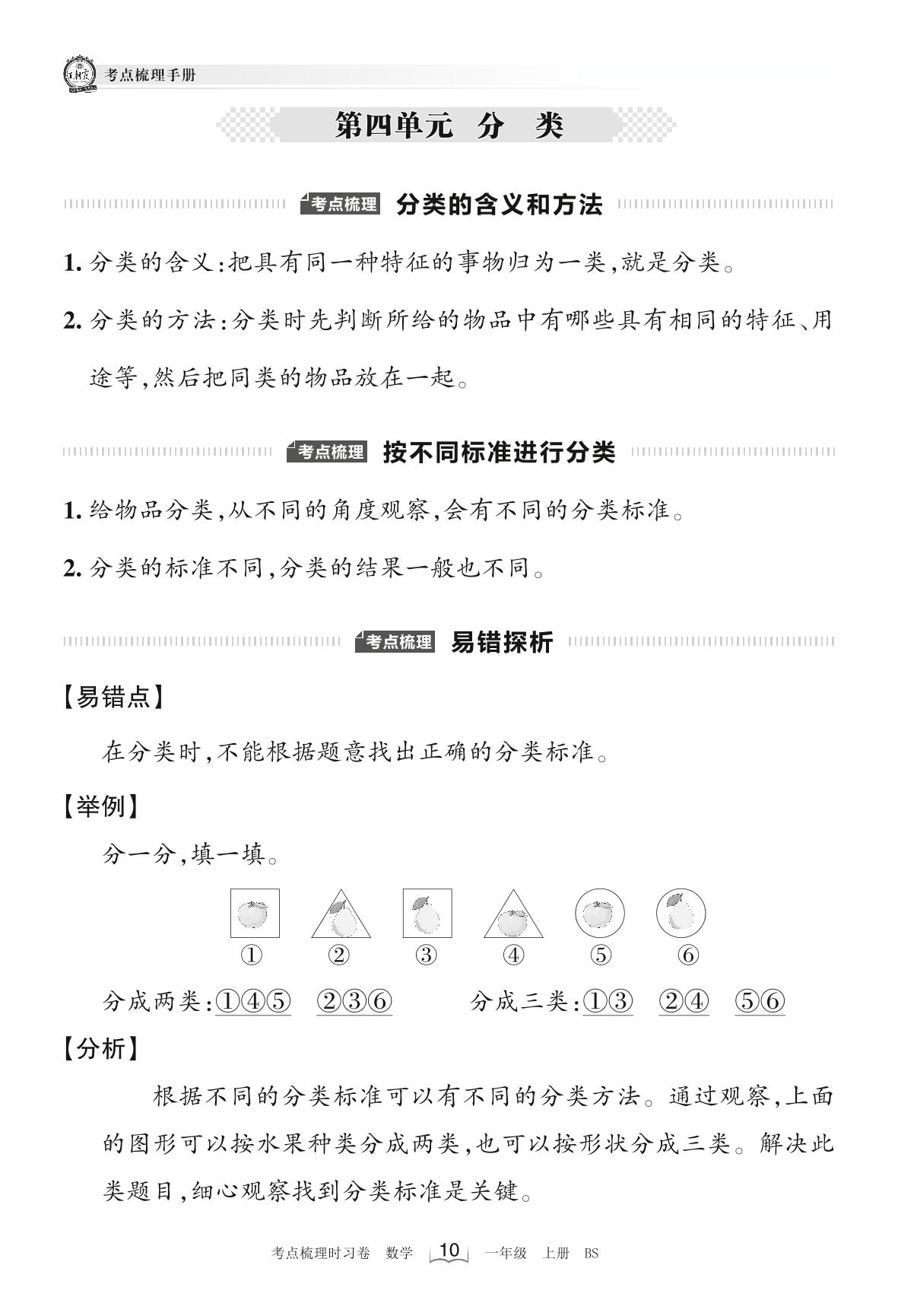 2022上册一年级数学北师版 考点梳理手册——第四单元 分类