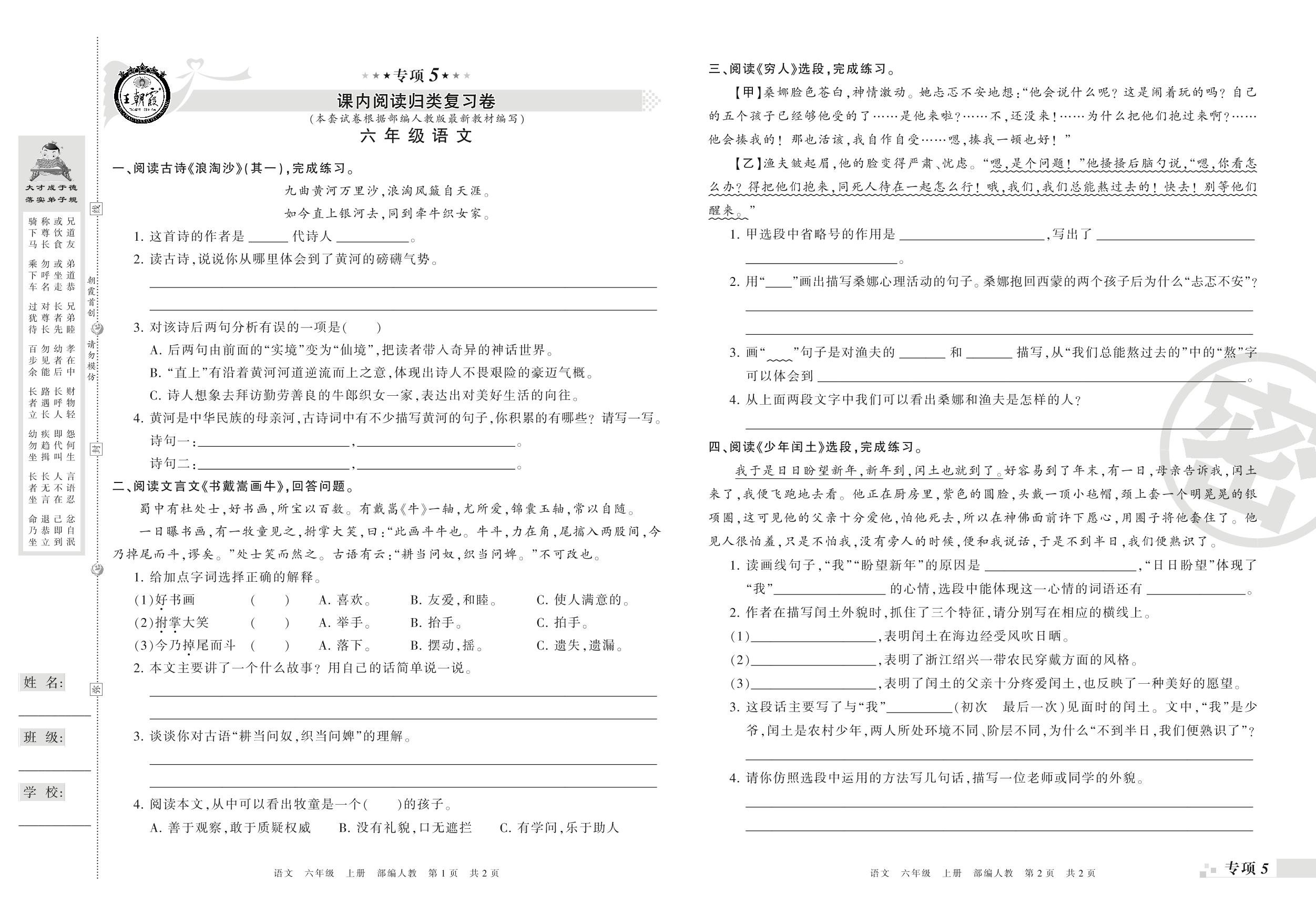 王朝霞期末专项卷——课内阅读、课外阅读与写作归类复习六年级上册语文(人教版)_R21080242038【0】